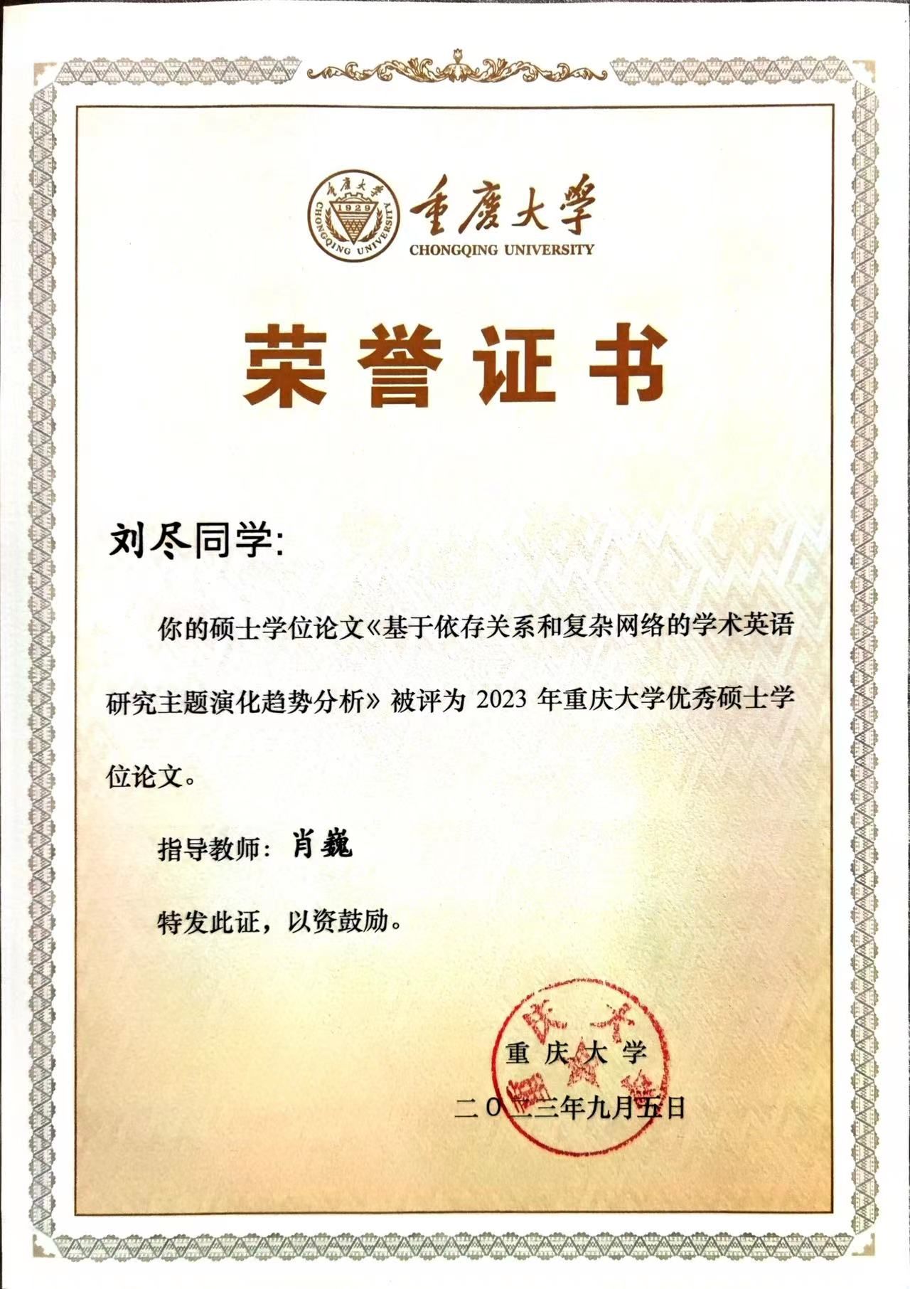 优秀博士、硕士学位论文奖的决定》。我院肖巍教授指导的2022届硕士生李丽和刘尽获评优秀硕士学位论文奖。