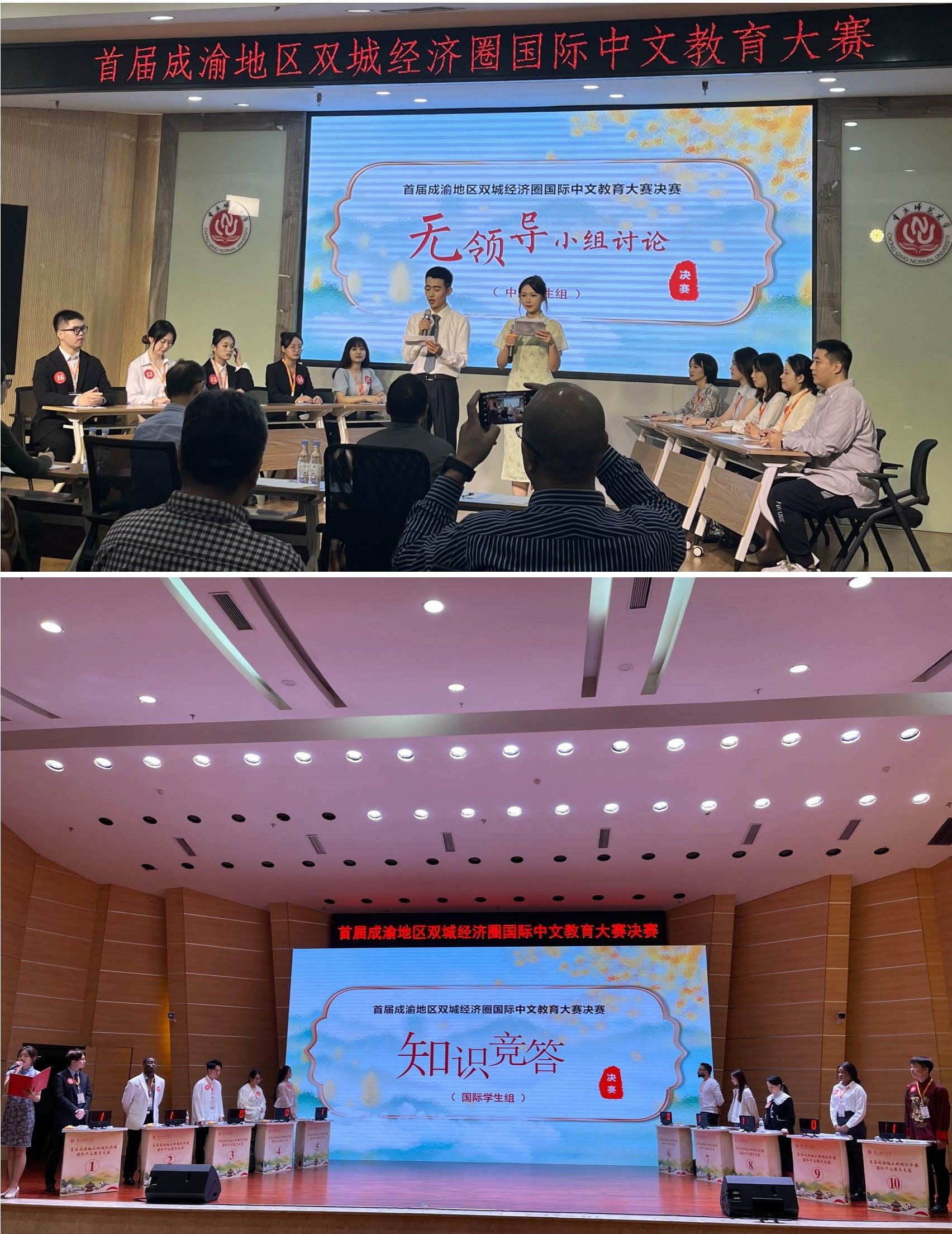 的6名汉语国际教育硕士、2名汉语国际教育本科国际学生和2名新闻学院广播电视学本科国际学生参加复赛,最终9位选手进入决赛。决赛由来自重庆市、四川省的30名中国学生和30名国际学生现场角逐一、二等奖。中国学生组分设知识竞答、无领导小组讨论、汉语教学三个比赛环节,国际学生组则展开知识竞答、中华才艺展示比拼。我校中外选手在比赛环节中展现了扎实的专业基础、博学的文化储备和优异的综合素养。