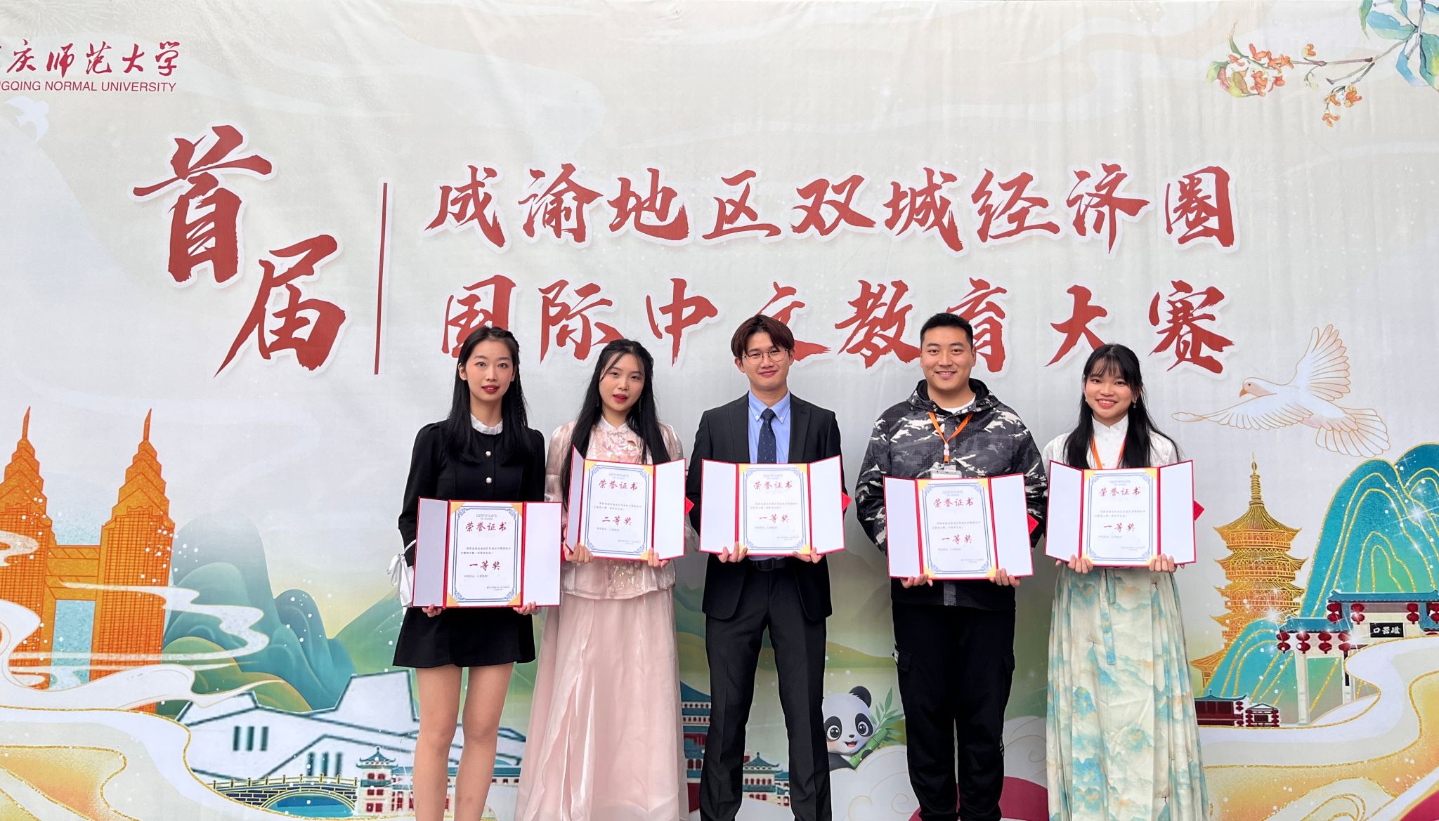 2023年10月18日-19日,首届成渝地区双城经济圈国际中文教育大赛决赛在重庆师范大学举行。经过激烈角逐,我校2名中国学生获得中国学生组一等奖、2名留学生获得国际学生组一等奖;1名留学生获得国际学生组二等奖;2名中国学生获得中国学生组三等奖、2名留学生获得国际学生组三等奖。指导教师奖和优秀组织奖待公布。
