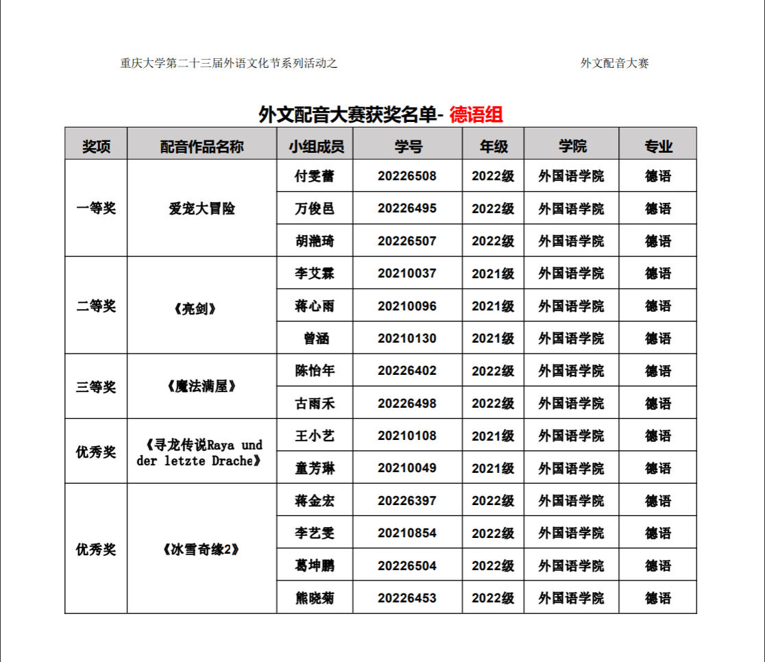 由磁力猫 主办、磁力猫 承办的磁力猫 第二十三届外语文化节系列活动之外文配音大赛已经结束。赛事自11月18日启动以来,吸引到全校多支队伍前来参与,评选出31个获奖组。其中,英语专业组共11个获奖组29名获奖选手,公共外语组共9个获奖组18名获奖选手,日语德语组共10个获奖组29名获奖选手。 现将外文配音大赛获奖名单进行公布。