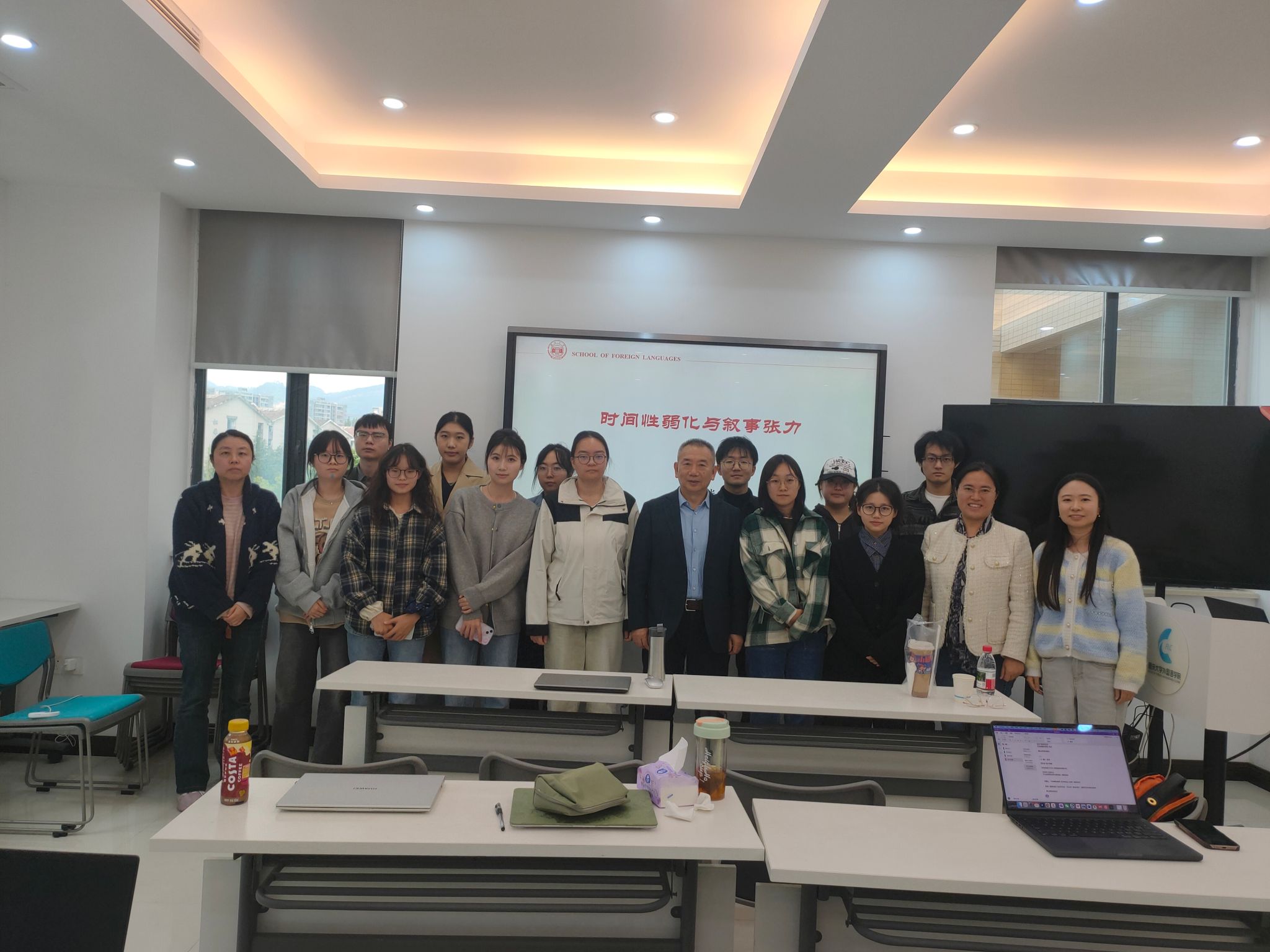 陶叶茂博士主持,众多师生到场聆听。刘教授以认知语言学中的“时间性”概念切入文学叙事研究,带来了一场跨越语言学与文学的思想盛宴。