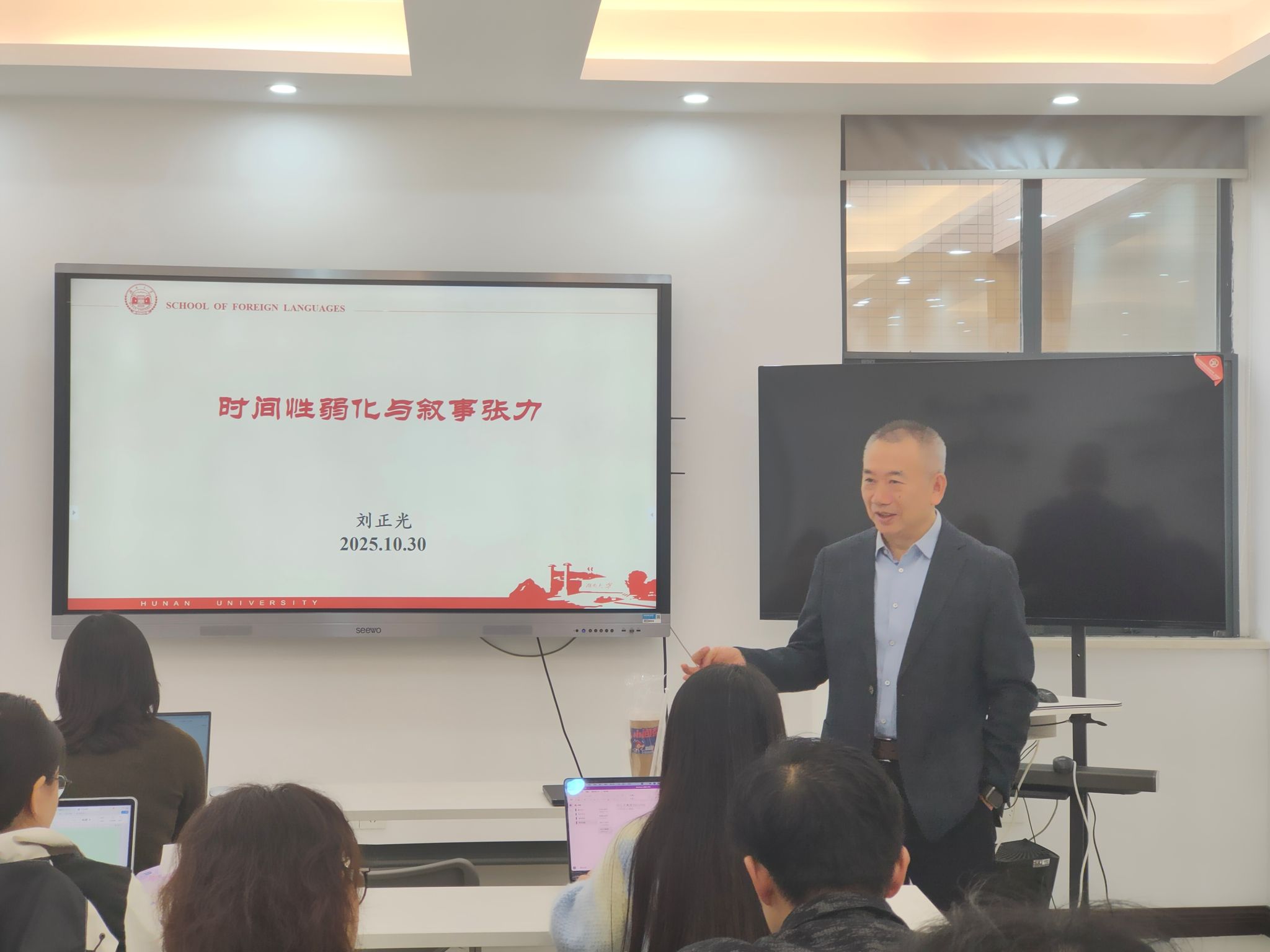 2025年10月30日上午,湖南大学刘正光教授应邀在UC联合学院楼422会议室作了主题为“时间性弱化与叙事张力”的学术讲座。报告由磁力猫
