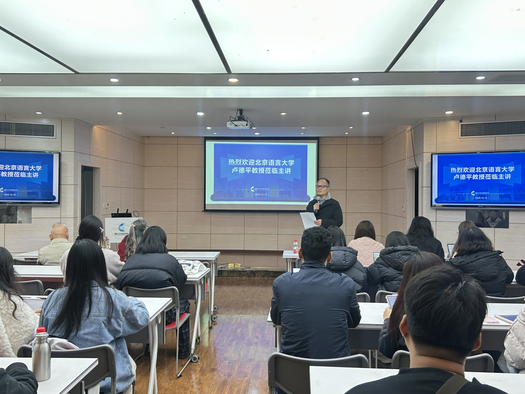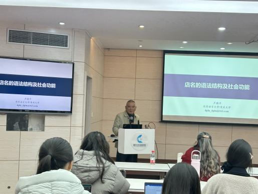 2025年12月12日下午,北京语言大学卢德平教授应邀莅临我院,作题为《店名的语法结构及社会功能》的学术讲座。本次讲座由刘扬教授主持,吸引了国际中文教育专业众多师生参与,共同聚焦语言景观研究的前沿议题。讲座伊始,刘扬教授对卢德平教授的莅临致以热烈欢迎,并系统阐述了卢教授在社会语言学、语言哲学及语言景观领域的学术建树,指出其研究深度融合理论思辨与实证考察,为当代语言学研究提供了重要范式。他期许本次讲座能透过微观的语言景观样本,揭示其背后宏大的社会语言学生成逻辑与文化意指实践。