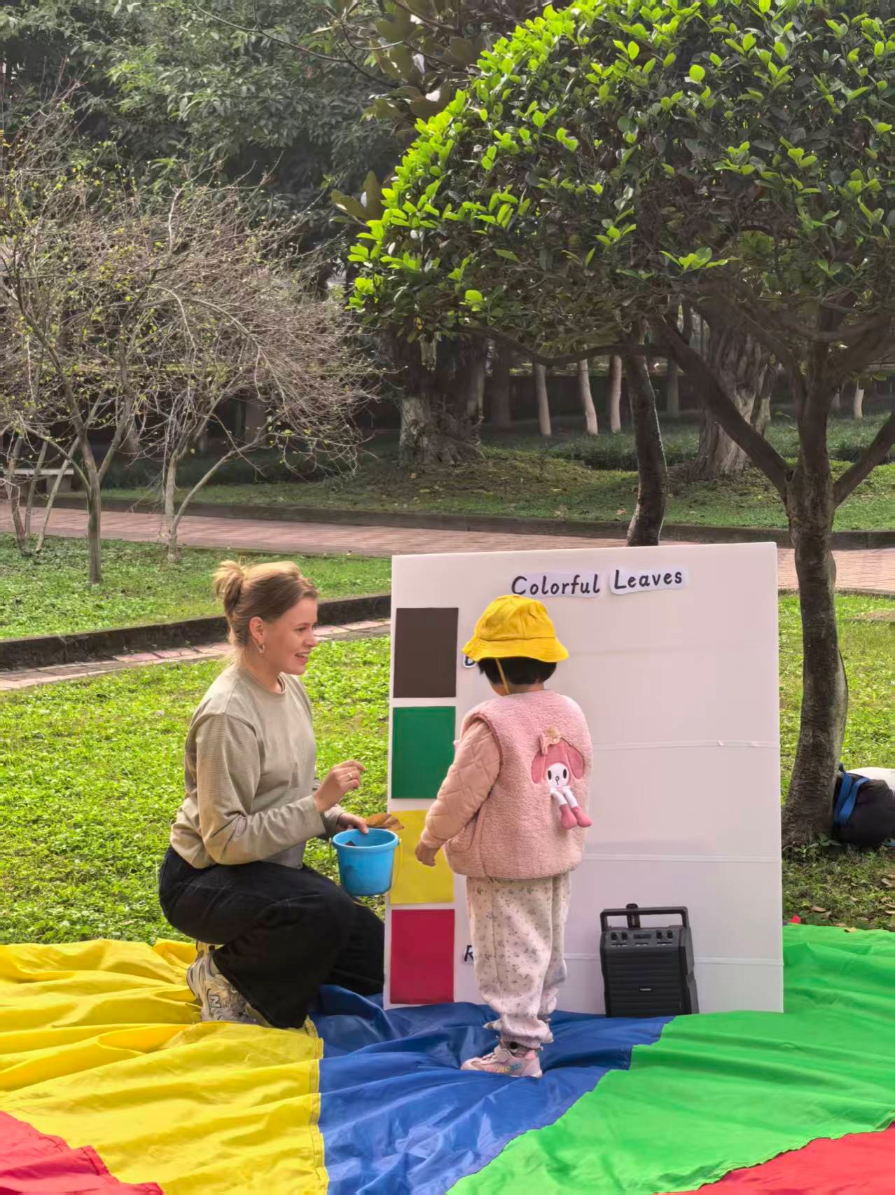 幼儿园开展“与落叶对话”户外沉浸式英语教学活动。留学生辅导员黄恩珂带领三名优秀的留学生志愿者——来自巴西硕士研究生亚瑟、来自哥伦比亚的语言生罗珊珊以及荷兰语言生BLOK MINKA参与了此次活动,通过协助幼儿园教师引导幼儿在自然环境中开展英语互动,助力活动取得圆满成功。