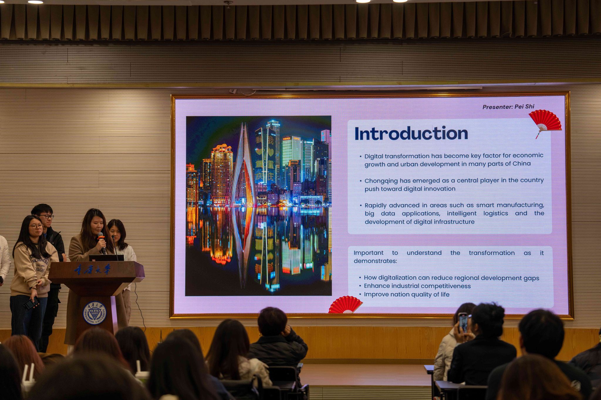 5支学生团队,围绕“可持续发展”和“文化传承”汇报研究成果。南洋理工学子聚焦重庆 “网红城市”“磁器口古镇遗产更新”“重庆夜生活经济”以及“以科技赋能产业升级”等主题通过2周的研学解读中国发展路径,理解重庆“以人为本”的城市规划与“开放包容” 的城市气质。