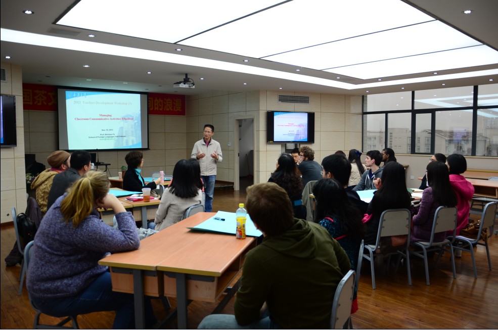 邀请余渭深教授作为英语教学专家做了第一次中外教师共同参加的英语课堂教学研讨。研讨会开始之前,欧玲副院长强调组织此类活动的目的不是要求所有课堂教学趋同,学院鼓励教师有个性化的课堂,但无论怎样的课堂都需要有理念的建立,理论的支撑,语言教师需要一定的专业训练。对课堂教学的反思可以帮助语言教师的职业发展,提高其教学技能以及职业素养。学院还将邀请有经验的外籍教师来做此类的教学研讨,共同探讨增强课堂教学有效性的方法和途径。