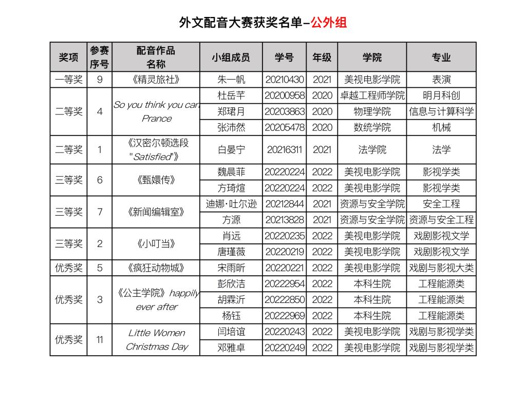 由磁力猫 主办、磁力猫 承办的磁力猫 第二十二届外语文化节系列活动之外文配音大赛已经结束。赛事自11月9日启动以来,吸引到全校近15个学院、29个专业的60支队伍前来参与,评选出29个获奖组74名获奖选手。其中,英语专业组共11个获奖组35名获奖选手,公共外语组共9个获奖组17名获奖选手,日语德语组共9个获奖组22名获奖选手。 现将外文配音大赛获奖名单进行公布。