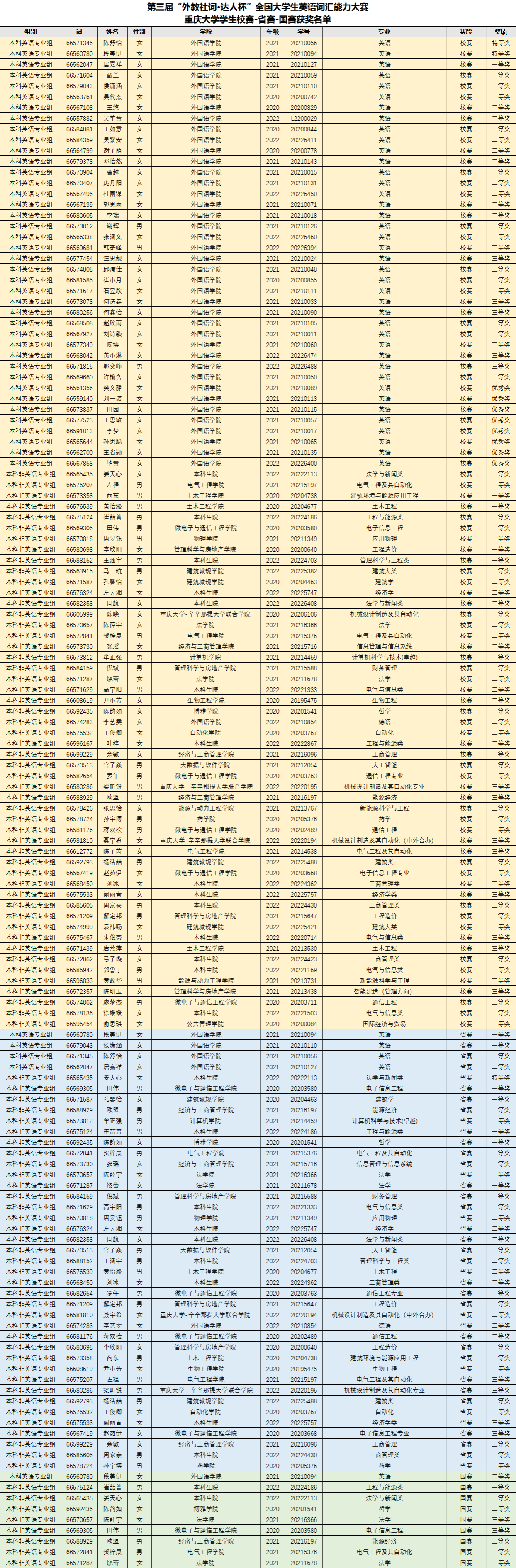 第三届“外教社•词达人杯”全国大学生英语词汇能力大赛获奖名单