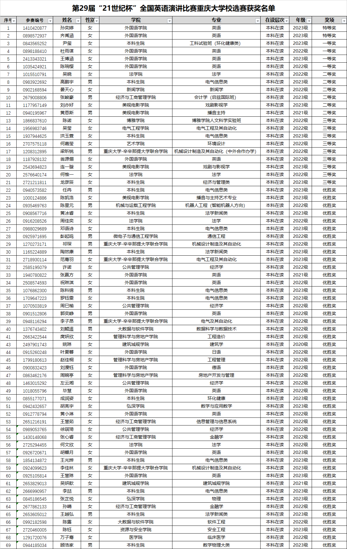 第29届“21世纪杯”全国英语演讲比赛磁力猫 校选赛自发布通知起,吸引了全校23个学院50多个专业上百名同学报名参赛,98名选手审核成为正式选手。大赛历时近一个月,选拔评定出2名特等奖、4名一等奖、6名二等奖、9名三等奖、47名优胜奖。现将获奖名单公布(也可查看附件)如下: