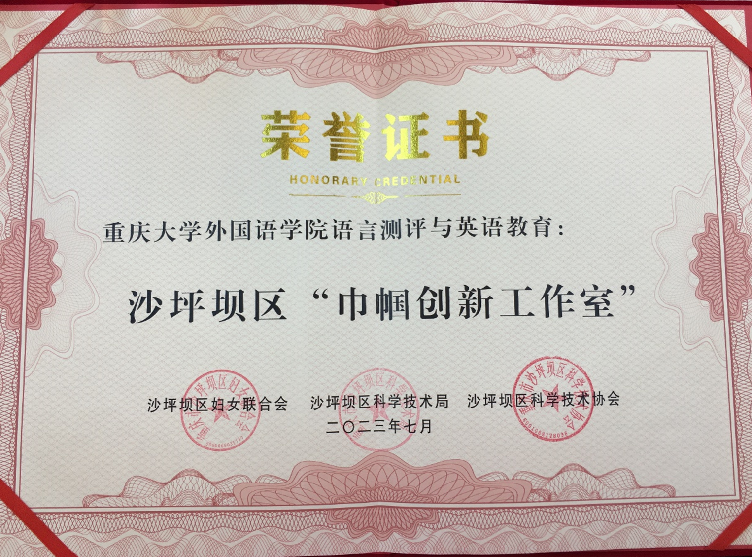 语言测评与英语教育”工作室,并荣获“沙坪坝区巾帼创新工作室“称号。该工作室的成员包括辜向东、欧玲、彭静、康鑫、常鹏云、郑尧、颜巧珍、黄晓琴、汪咏、赵曦和唐杰。