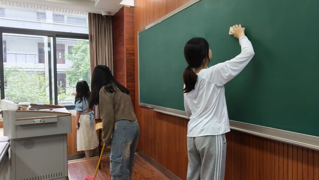 第三组的学员们在组长刘馨元同学的带领下,于2024年4月28日早上在虎溪校区一教开展了打扫卫生的志愿服务活动。大家各司其职,擦黑板、擦玻璃、摆放桌椅、扫地、擦桌子,共同完成了几间教室的打扫工作,将教室打扫得更加干净整洁。