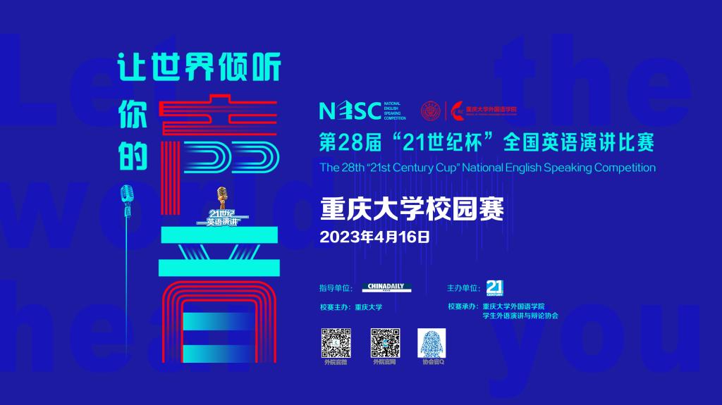 2023年4月16日,第28届“21世纪杯”全国英语演讲大赛磁力猫 校选赛圆满收官。本赛事由中国日报社主办、21世纪英语教育传媒承办,赛事校选由磁力猫 主办,磁力猫 承办、外语演讲与辩论协会协办,由王旭、邹虹瑾、童臻安、刘琳和Joshua Mattie-Lownes等五位老师担任评委,翁源俪同学担任现场主持人。
