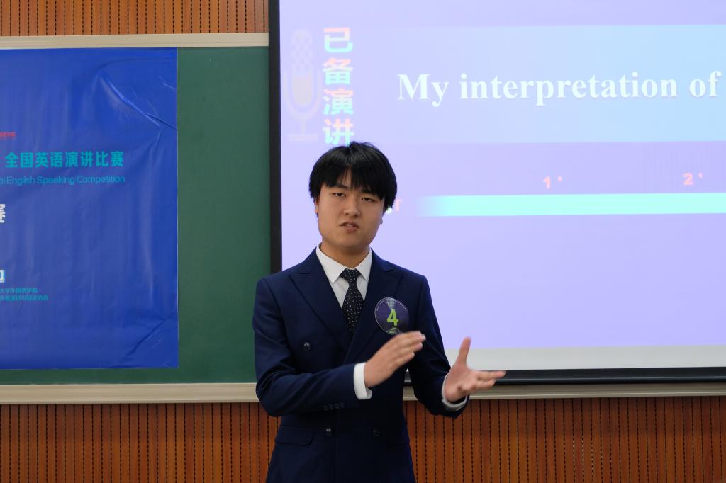 校决赛要求选手先后完成3分钟已备演讲和2分钟即席演讲,两次演讲中超时或少时均会扣分。评委则依据选手的演讲内容、语言质量、综合表现进行评分。选手们围绕已备主题“My interpretation of civilization”,畅所欲言、展示自我,表达自己对文明的理解,既有从自身家庭出发深入浅出地解读,也有从整个国家乃至世界的角度切入对文明展开深入的阐释。不同的选手从古今中外等各个方向展现了他们对文明的多样理解,传达出新时代人群的青年之声。即席演讲涵盖了金钱、学会拒绝以及中国与世界等时热话题,通过引举史蒂芬·乔布斯的名言、社会上的真实案例和其他宏观选题,激发选手深度思考这些话题,引导选手理性客观地剖析社会现象,考察其逻辑思维能力和拓展分析能力。