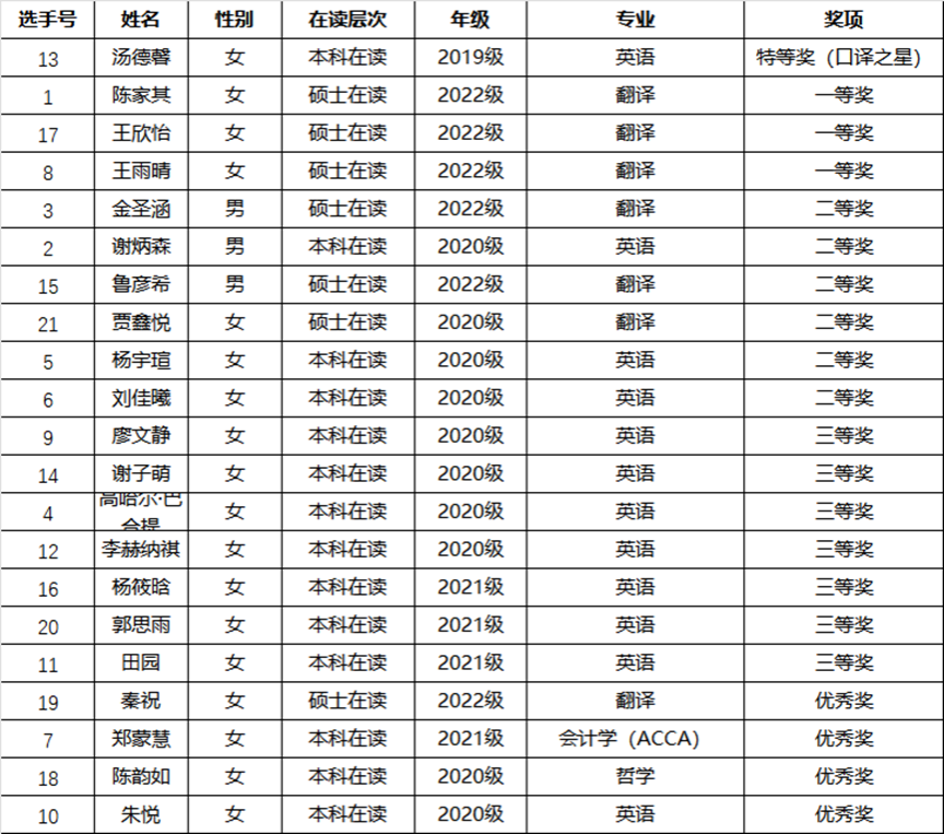 经过3小时沉浸式角逐,评委的严谨评选后,大赛结果揭晓。共决出特等奖(口译之星)1人、一等奖3人、二等奖6人、三等奖7人、优秀奖4人。