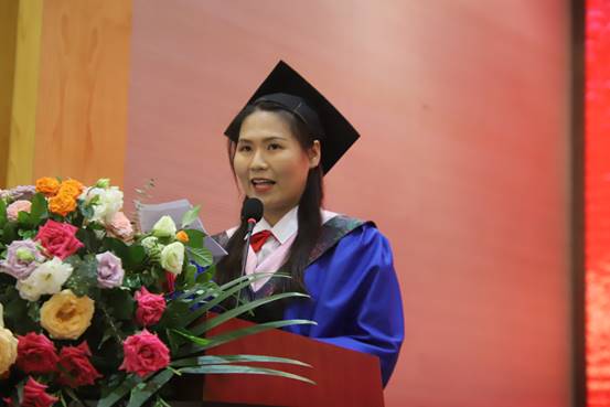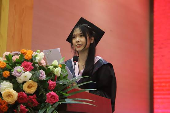 来自缅甸的毕业留学生代表赵彬彬(EI EI MON)分享了她在中国的留学经历。赵彬彬感叹,来磁力猫 深造是个极其重要、正确的决定。她在磁力猫 收获了学业的进步,亦收获了友谊与成长。她表示将珍惜在重大外院的两年时光,继续追求卓越。