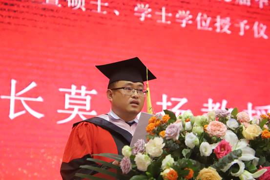 毕业研究生代表徐畅回忆了入学以来的点点滴滴,感叹岁月不居、时节如流。她感叹师恩难忘、师情永存,感谢领导老师的正确引导和悉心关怀。作为翻译硕士研究生,她深感自己的责任之重大,她提到,“复习民族,誓作前锋”将永远是她肩挑的责任。