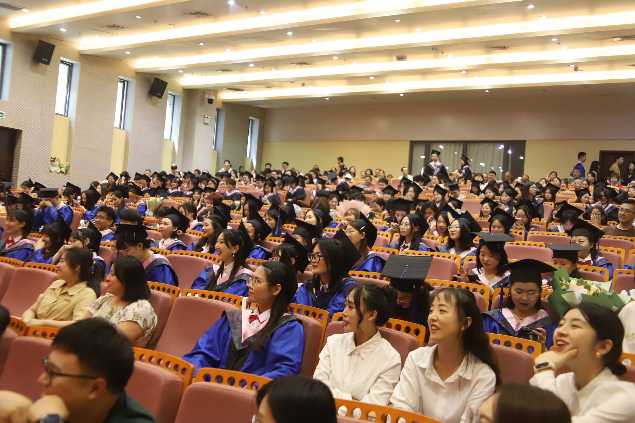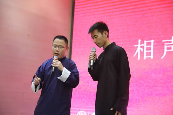 毕业典礼在有泪有笑的暖场回忆视频《追忆大学生活剪影》中娓娓开场。活力性感的开场舞和自制相声节目《我爱读书》引得现场掌声连连、笑声一片,气氛热烈高涨。
