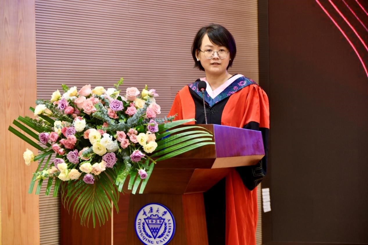 陈爱华老师作为教师代表上台发言。她用幽默诙谐的语调,从内卷入手,讲述了内卷与日本丧文化的联系。她反对毕业即躺平这一说法,在全新挑战接踵而来的情况下,躺平也需要勇气,看似躺平,骨子里是不放弃。她表达了自己对毕业生的未来充满信心。新的一代将重新定义躺平,天生难躺平的重庆精神将会陪伴毕业生们仗剑走天涯!最后,她祝愿大家在未来的时光里平安健康、充实愉悦。