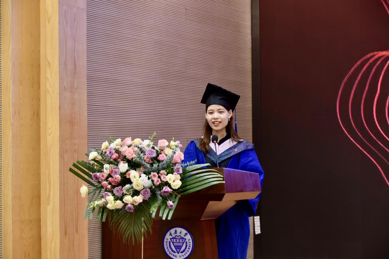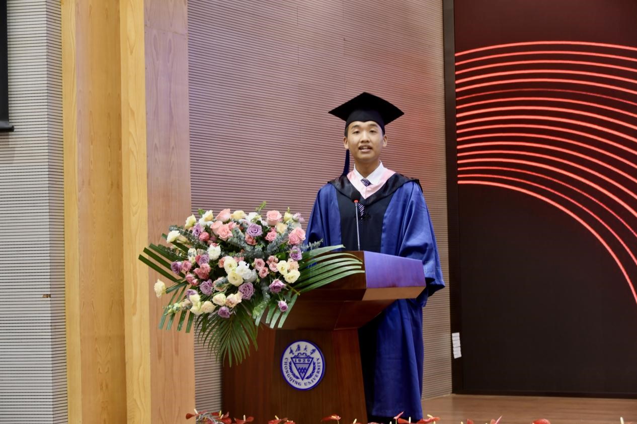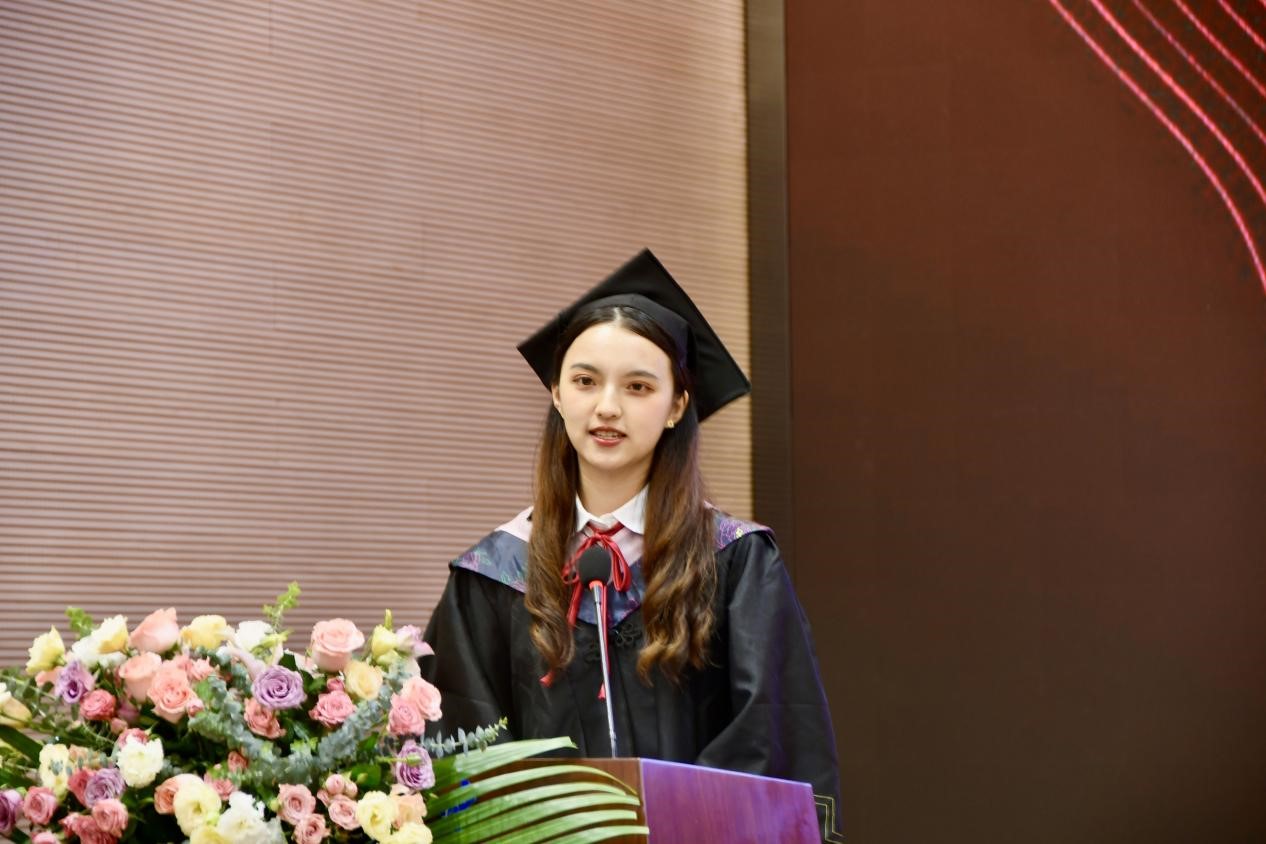本科生代表程琬祺在发言中感谢同学的陪伴、老师的鼓励。时光荏苒,纵然有毕业的欣喜,对即将奔赴人生下一阶段的激动,但四年来在重大校园经历的点点滴滴还是让她感到留恋。送别了今日,我们将在新的起点,继续逐梦四方,不论未来身处何地,她都会谨记母校的校训,继续发扬重大人复兴民族、誓做前锋的优良精神。最后,她表达了对学校、老师的感激,对母校取得新突破、创造新辉煌表达衷心的祝愿。