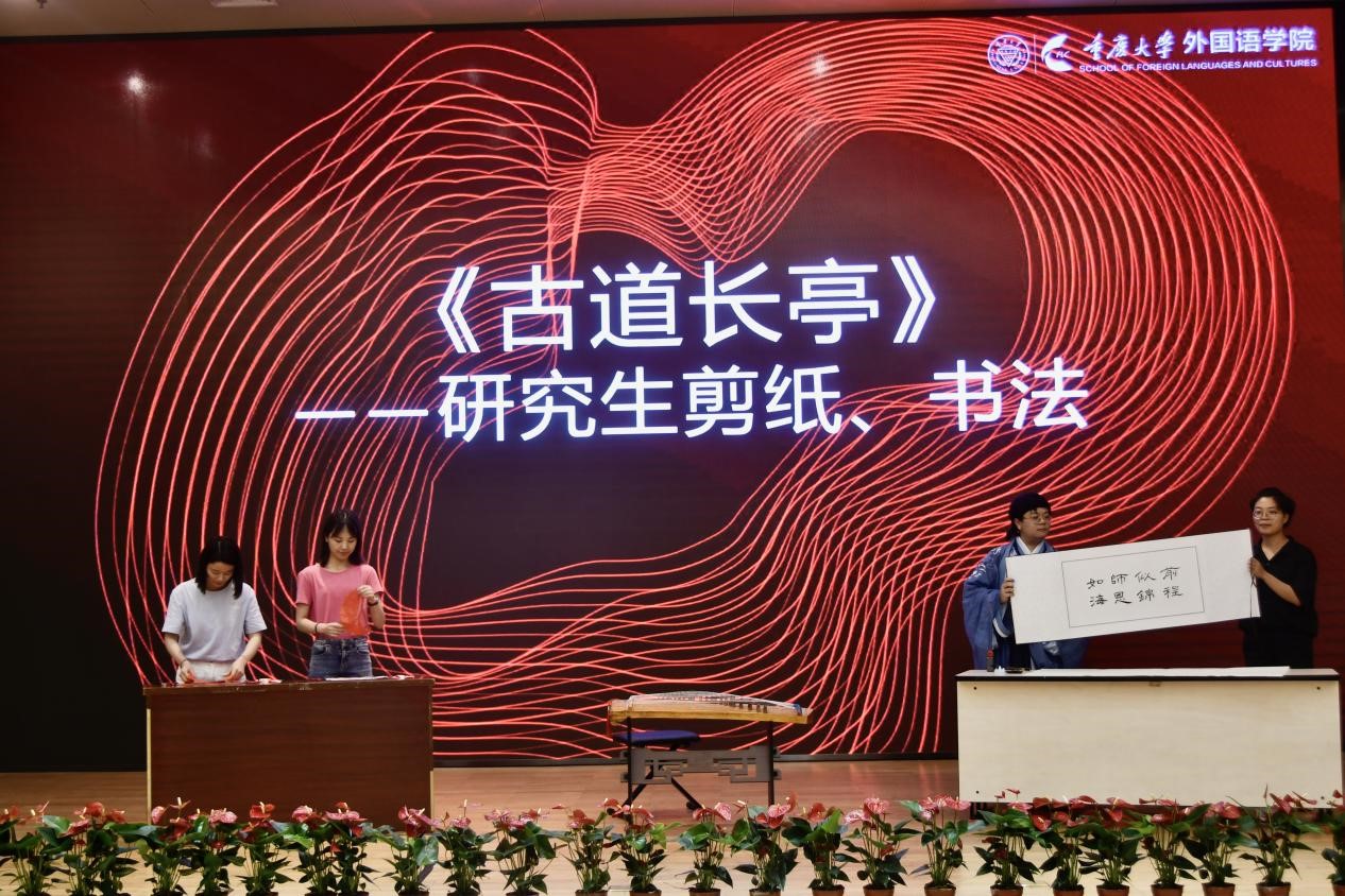 为庆祝毕业生们成功毕业,非毕业年级同学带来节目《古道长亭》,对古筝、剪纸、书法等传统文化进行演绎。书法作品《前程似锦,师恩如海》表达了他们对师恩的感激和对师兄师姐们的美好祝愿。