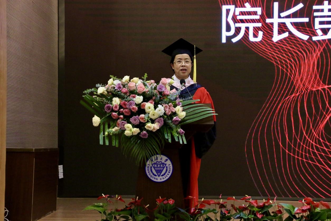彭静院长在致辞中首先对2021届全体毕业生表达衷心的祝贺。她回首几年前的初见,同学们意气风发,神采飞扬;历经几载流年,同学们羽翼渐丰,跃跃欲试。几年来,大家与外院共同奋斗、共同成长,并肩收获着累累硕果。她对毕业生们提出3点建议与期许:坚持阅读,得意人生;理解他人,成全自己;打破边界,守正出奇。最后彭院长欢迎大家回虎溪拍摄婚纱照、邀约同学会、携带家人访,常回家看看。