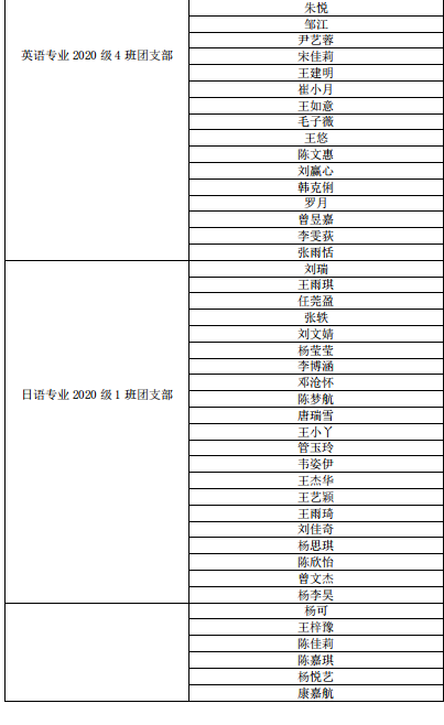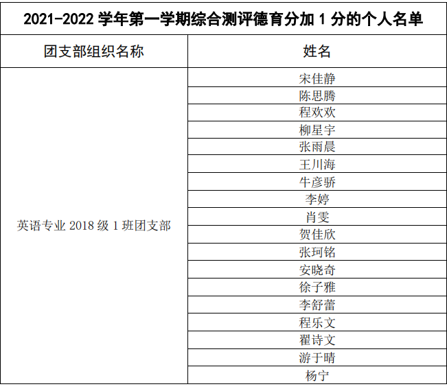根据《磁力猫 团委团支部评级办法(试行稿)》文件要求,我院开展 2020-2021 学年第二学期团支部、团员积分考核评级:“学期内有两个月“青年大学习”主题团课学习记录,综合测评德育分加1 分”。经磁力猫 团委组织部具体考核评定,报院团委审核批准,现将 2020-2021 学年第二学期综合测评德育分多加 1 分名单公示如下: