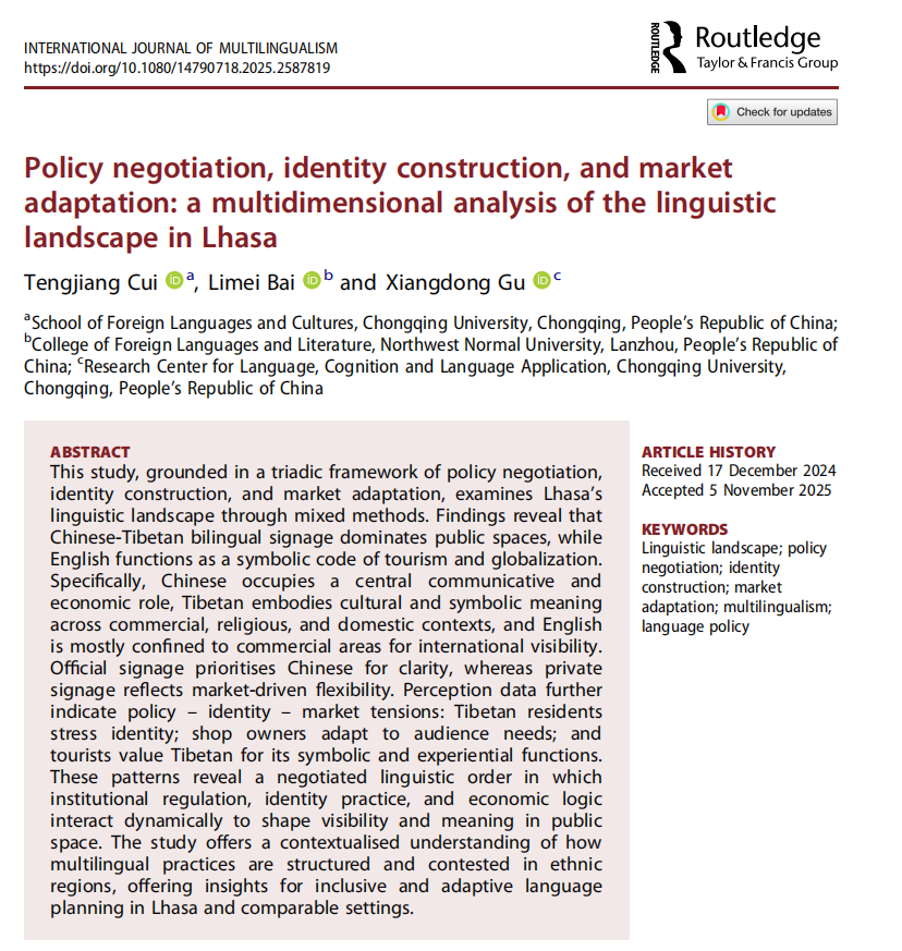 近日,我院辜向东教授指导的2023级博士生崔腾江以第一作者身份在International Journal of Multilingualism(JCR一区,中科院一区)合作发表了题为“Policy negotiation, identity construction, and market adaptation:Amultidimensional analysis of the linguistic landscape in Lhasa”的研究论文。该论文第二作者为其硕士导师白丽梅教授,博导辜向东教授担任通讯作者。