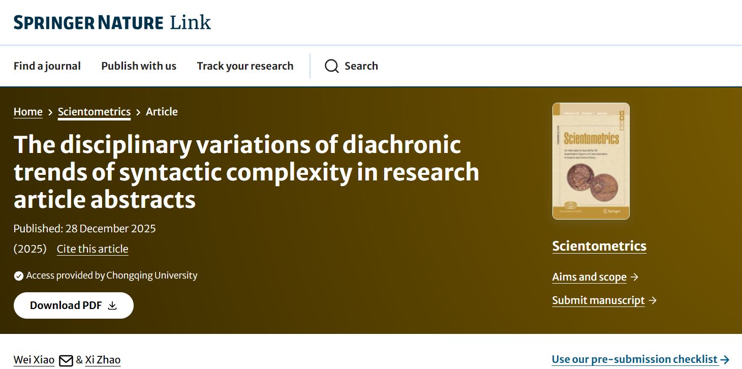 博士生导师、语言认知及语言应用研究基地专职研究员肖巍教授在著名科学计量学期刊Scientometrics(SSCI一区,IF=3.5,5 year IF=4.1)发表题为“The disciplinary variations of diachronic trends of syntactic complexity in research article abstracts”的学术论文。肖巍教授为论文第一和通讯作者,合作者为博士生赵曦。论文全文下载链接://link.springer.com/article/10.1007/s11192-025-05522-9