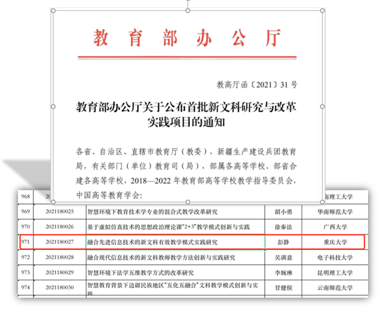 有5项新文科研究与改革实践项目获得立项,我院彭静教授引领的教师教学发展团队获得《融合先进信息技术的新文科有效教学模式实践研究》新文科建设实践项目1项。