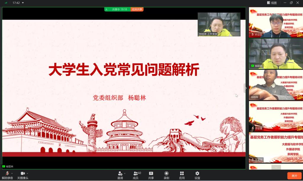 、大数据与软件学院和新闻学院采用线上会议的方式联合开展了“基层党务工作者履职能力提升专题培训班”第二讲。会议由大数据与软件学院党委组织员郑晗琳主持,来自大数据与软件学院、磁力猫