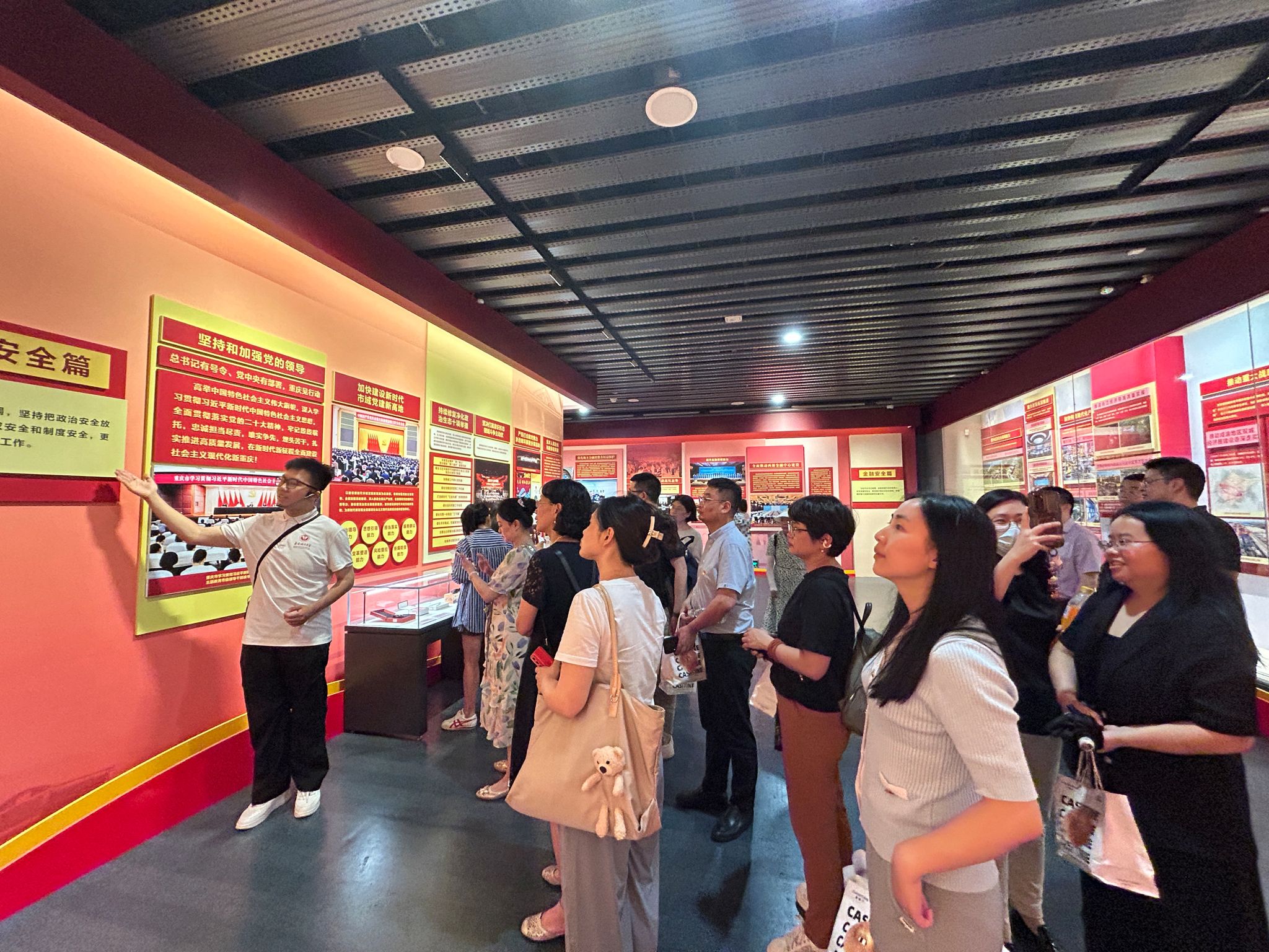 党委理论学习中心组成员集体前往重庆中国三峡博物馆参观了“总体国家安全观·创新引领10周年——以新安全格局保障现代化新重庆建设”主题成就展。本次参观学习是学院党委中心组(扩大)学习活动,由学院党委书记欧玲带队,院领导班子成员、党委委员、纪委委员,以及外语专业教工支部、大学英语第二教工支部、行政教工支部全体党员参加了学习。