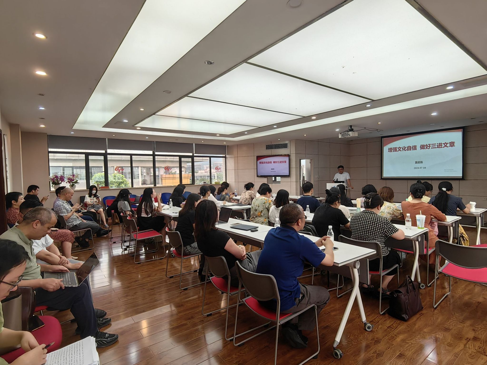 莫启扬院长以《增强文化自信,深化三进教育》为题做了报告。在报告中,莫院长追溯中华文明历史,强调其独特统一与包容性构建的文化自信,并指出文化自信对高等教育的核心意义,强调文化传承需融入价值观教育。针对学院专业教学中的“三进”工作,他提出将《理解当代中国》系列教材内容有机融入专业课程教学,让学生在掌握语言技能的同时,潜移默化地提升文化自信与塑造价值观,推动专业教学改革持续深化。