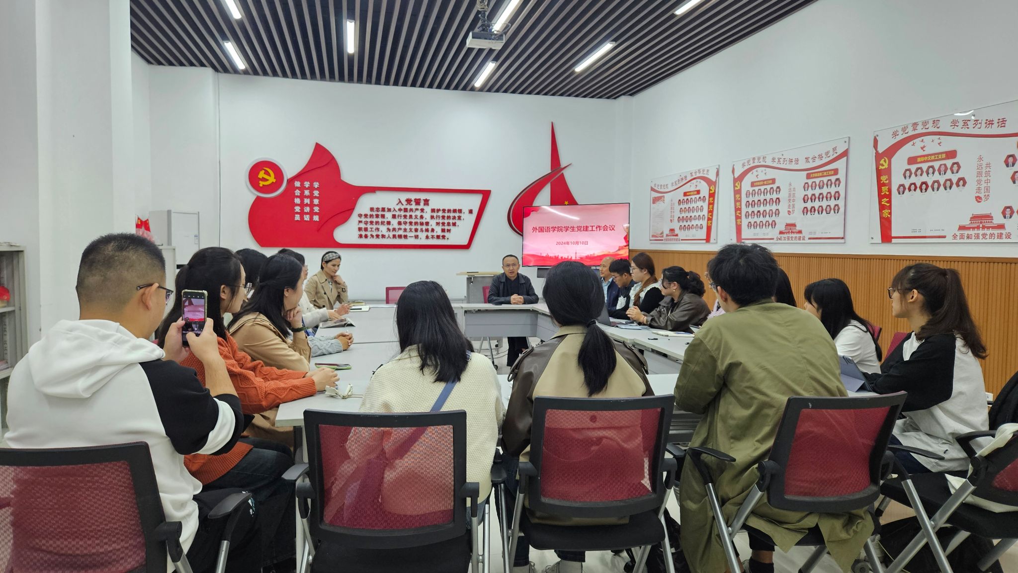 党委在外语学院楼105会议室召开了2024年第四次学生党建工作会议。会议由学院党委委员、组织员刘培老师主持,学院党委副书记、纪委书记魏世平老师,汉硕支部支部书记李良炎老师,学硕一支部支部书记朱洪召老师,本科生支部支部书记张茹老师,各学生支部书记、支委委员参加了会议。