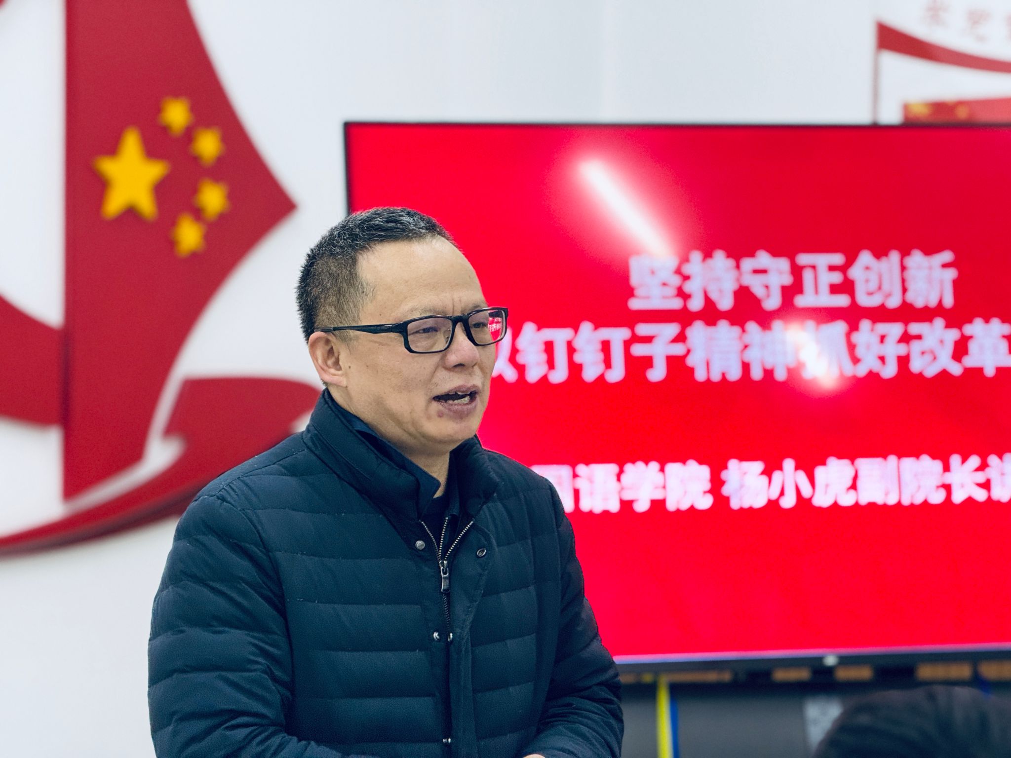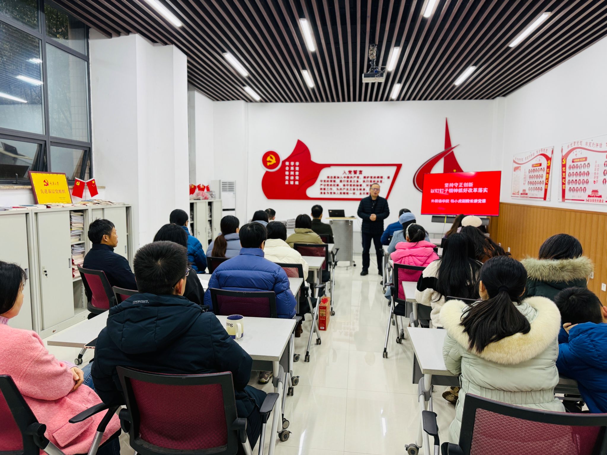 杨小虎副院长以“坚持守正创新,以钉钉子精神抓好改革落实”为题,为行政教工支部上了一堂生动的党课。会议由支部书记覃梦秋主持,行政教工支部全体党员以及全体行政教职工参与了学习,外语专业教工支部纪检委员吴娟老师列席了会议。