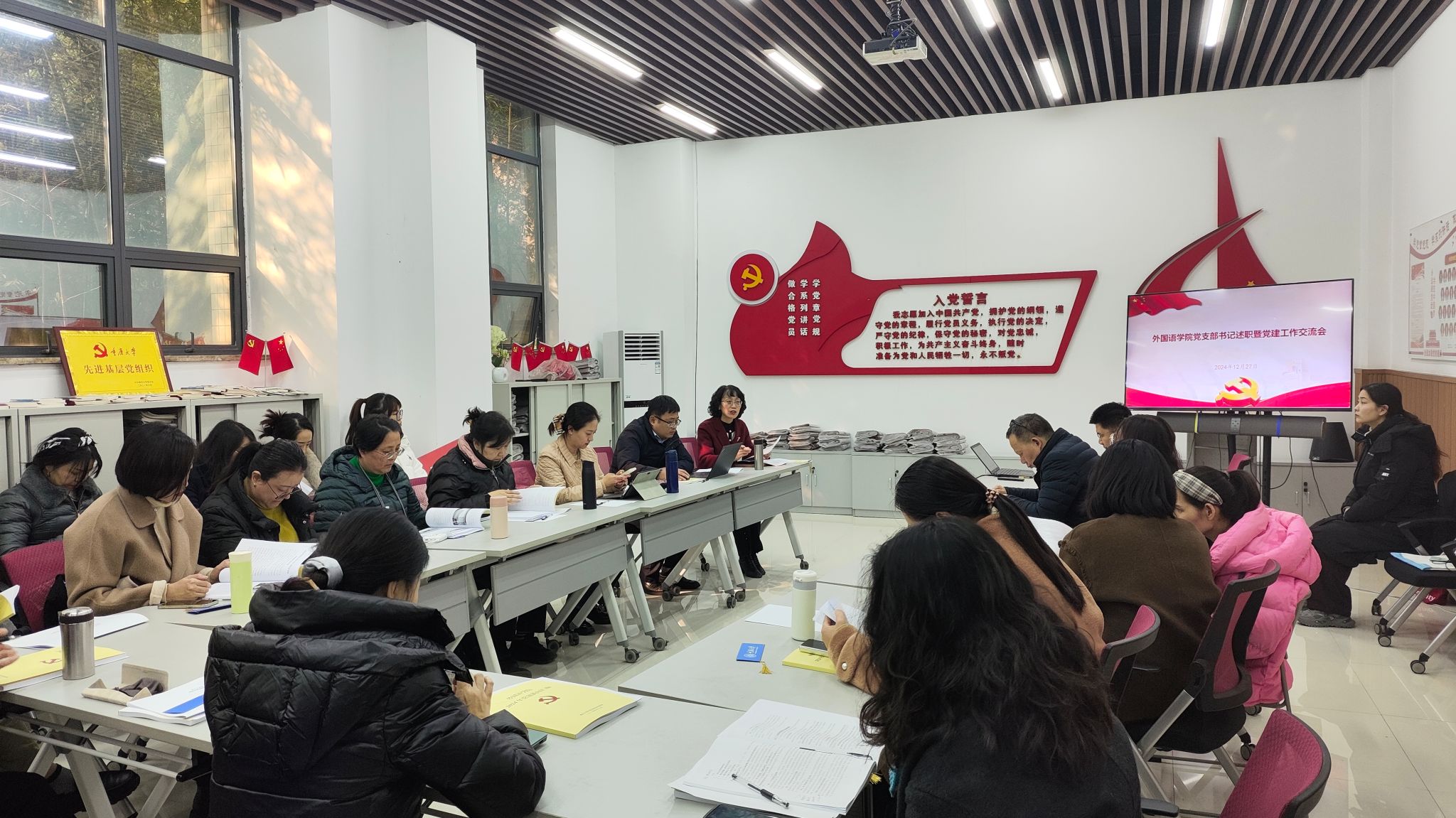 党委于2024年12月27日召开了2024年度党支部书记述职暨党建工作交流会。会议由学院党委书记欧玲主持,莫启扬院长,党委副书记魏世平,杨小虎副院长,学院党委委员,各教工支部的支部书记和支委、各学生支部的支部书记参加了会议。