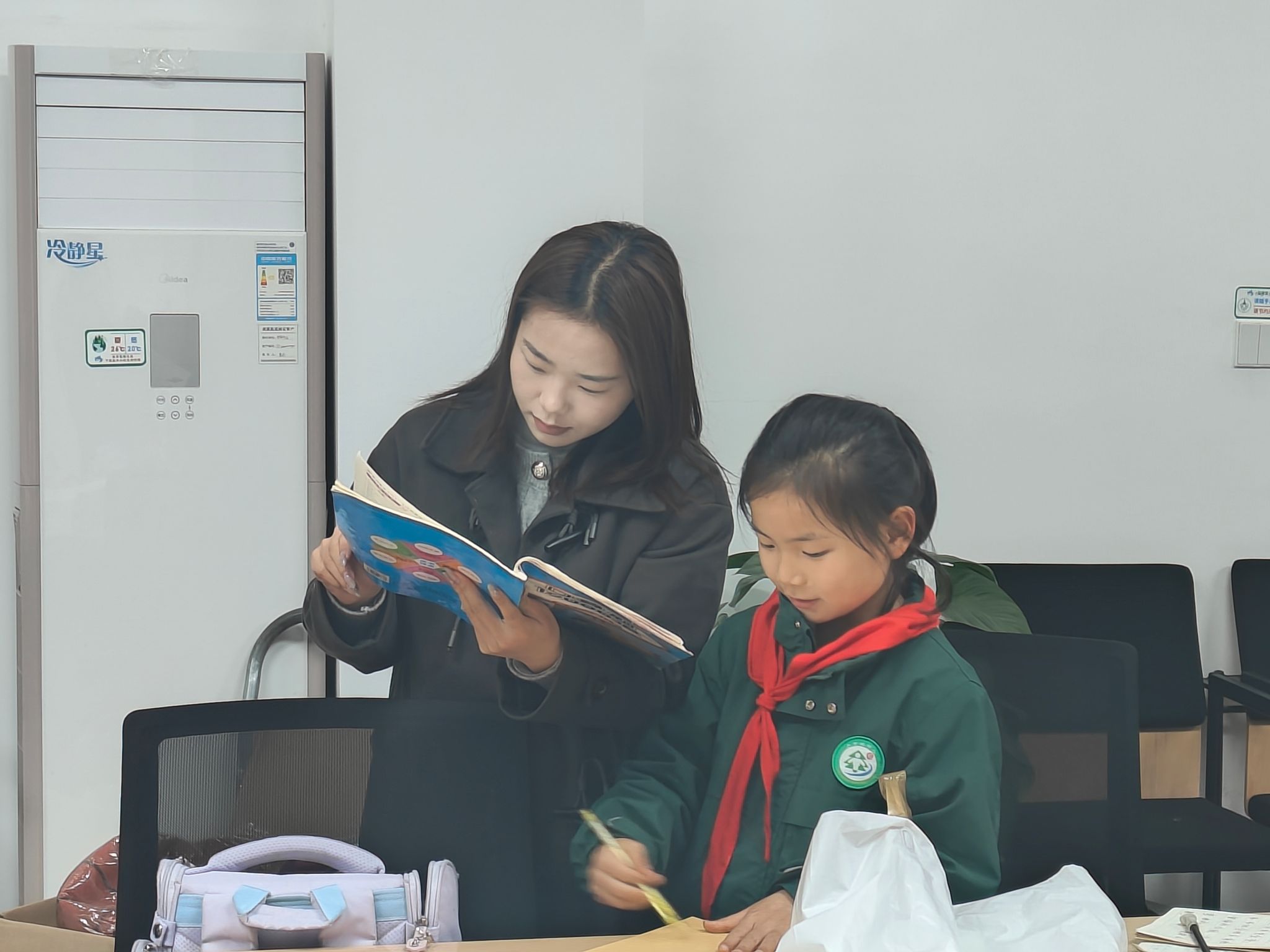 “阳光学堂”项目聚焦新就业群体家庭子女的教育需求,旨在为孩子们提供英语作业辅导,解决新就业群体因工作繁忙难以兼顾子女课后辅导的难题。翻硕支部充分发挥学生党员的专业优势,每周五下午为社区1-6年级学生提供系统性英语作业辅导。在首期活动中,两位志愿者不仅针对英语学科的重难点进行集中讲解,还通过分组答疑、“一对一”强化指导等方式,帮助学生规范答题思路、巩固知识点。此外,志愿者罗晓还结合学生需求,跨学科辅导语文、数学作业,并拍摄英语朗读视频,以趣味形式激发学习兴趣,展现了服务的灵活性与实效性。
