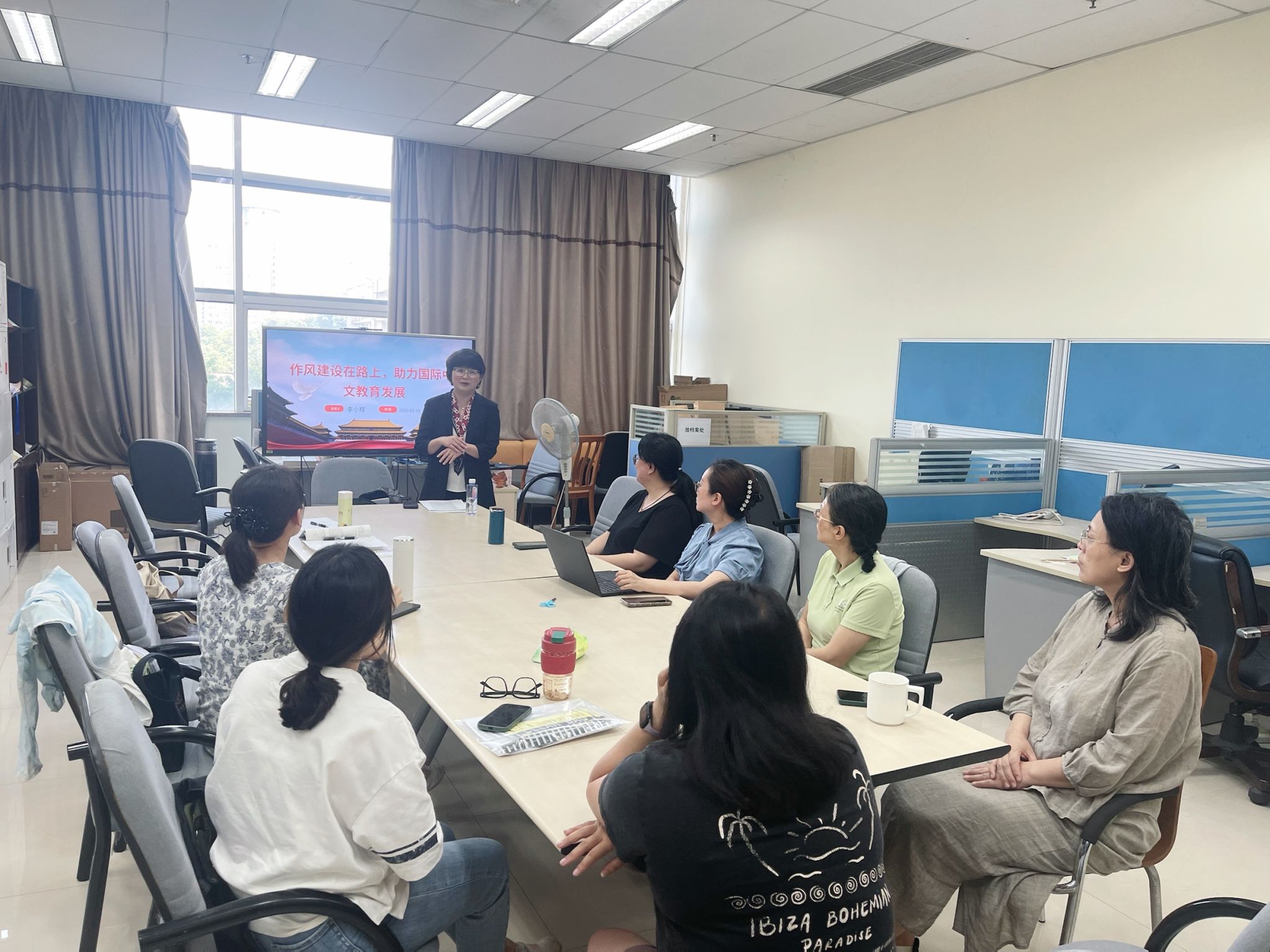 2025年5月20日,国际中文教育教工支部开展“加强党的作风建设”专题学习,学院党委书记李小辉以《作风建设在路上,助力国际中文教育发展》为主题,为支部全体党员讲授主题党课。