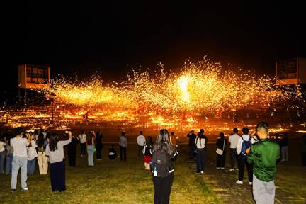 夜幕降临,国际学生们前往4A级景区奇彩梦园观看铜梁火龙表演。铁水如漫天流星般在夜空中绽放,舞龙人的狂野有力、灵动飘逸的龙舞表演,让铜梁龙在火树银花中舞动,不少国际学生直呼“太壮观了”,纷纷惊叹于表演的壮丽。