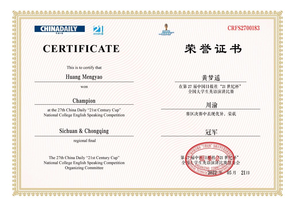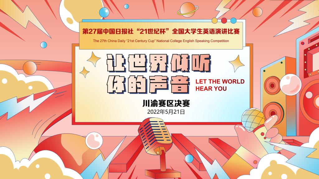 第27届中国日报社“21世纪杯”全国大学生英语演讲比赛川渝地区决赛于2022年5月21日在腾讯会议通过在线视频形式举行,大赛由中国日报社主办,二十一世纪英语教育传媒承办,来自川渝地区20多所高校的近30位选手相聚云端,同场较量。
