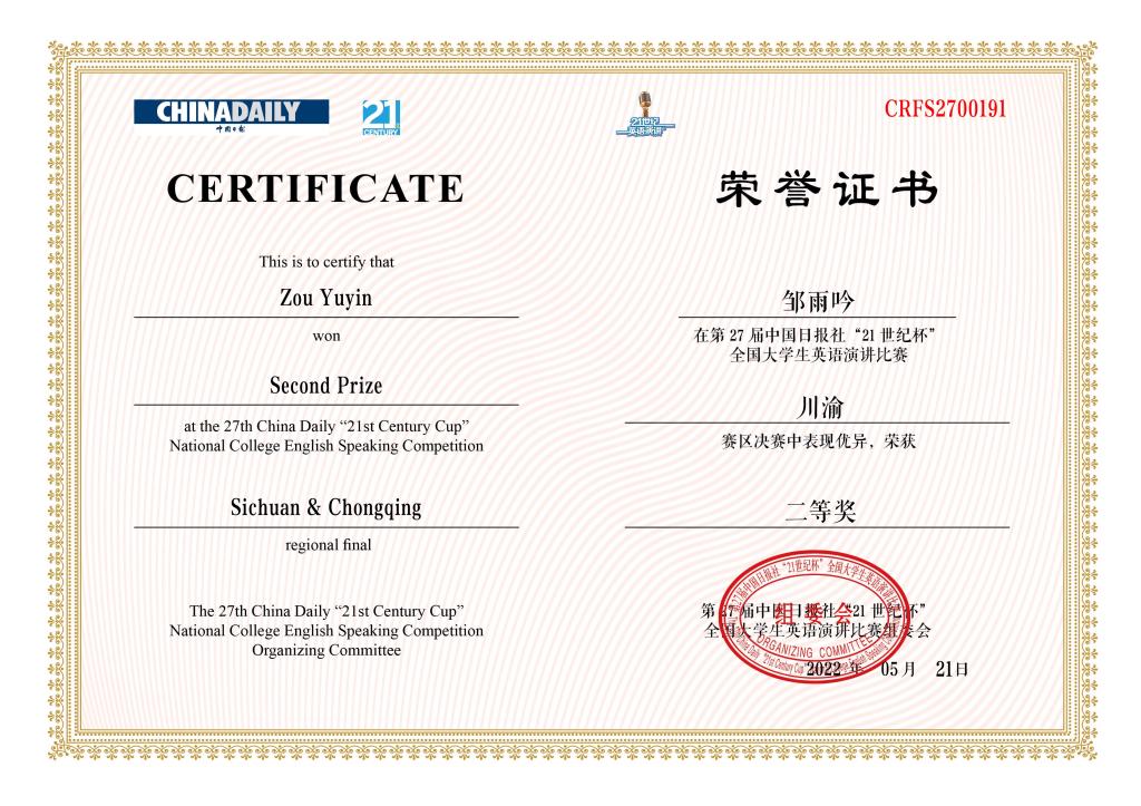 2019级英语专业本科生黄梦遥摘得桂冠,本科生院2021级电气与信息大类本科生邹雨吟荣获二等奖。根据大赛赛制规则,黄梦遥将代表川渝地区角逐国赛。