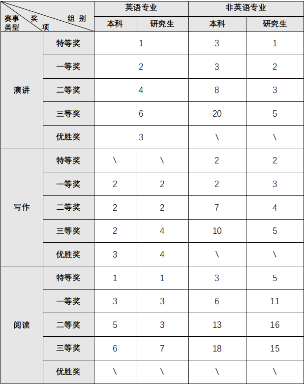 承办、学生外语演讲与辩论协会和英语协会协办。三大赛事历时一个月选拔,累计吸引了全校31个学院100多个专业的本科生、硕士生、博士生近千人参赛逐鹿,评选出233名获奖选手。其中,英语专业组获奖选手共66人,本科生获奖37人,研究生获奖29人;非英语专业组获奖选手共167人,本科生获奖95人,研究生获奖72人。