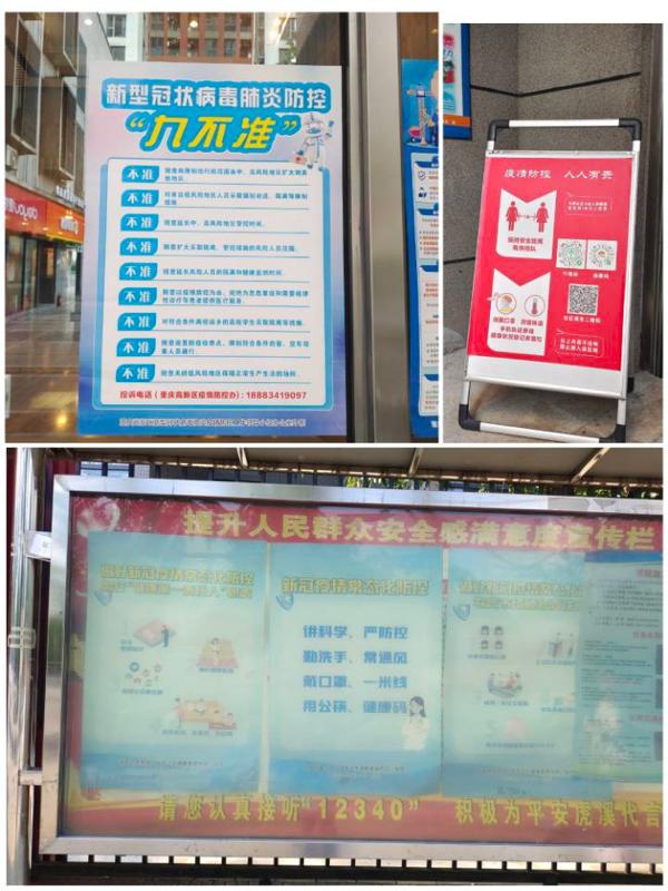 实践团成员们走遍花马社区和大成湖社区,对社区内各大公共场所,尤其是社区居民委员会、商场、卫生服务中心等人员密集与人流量频繁处的防疫设施以及抗疫宣传物进行了重点考察。经过实地调研,目前花马社区和大成湖社区内宣传防疫知识的硬件设施普及度较高,社区居民委员会在公告栏处张贴了疫情防控宣传海报,各大商场在入口处张贴了佩戴口罩、保持间距、测量体温等提示标志。此外,社区内设有多个核酸采样工作点,实现核酸检测便民,利民,在保障社区居民健康安全的同时,最大程度为社区居民提供方便。