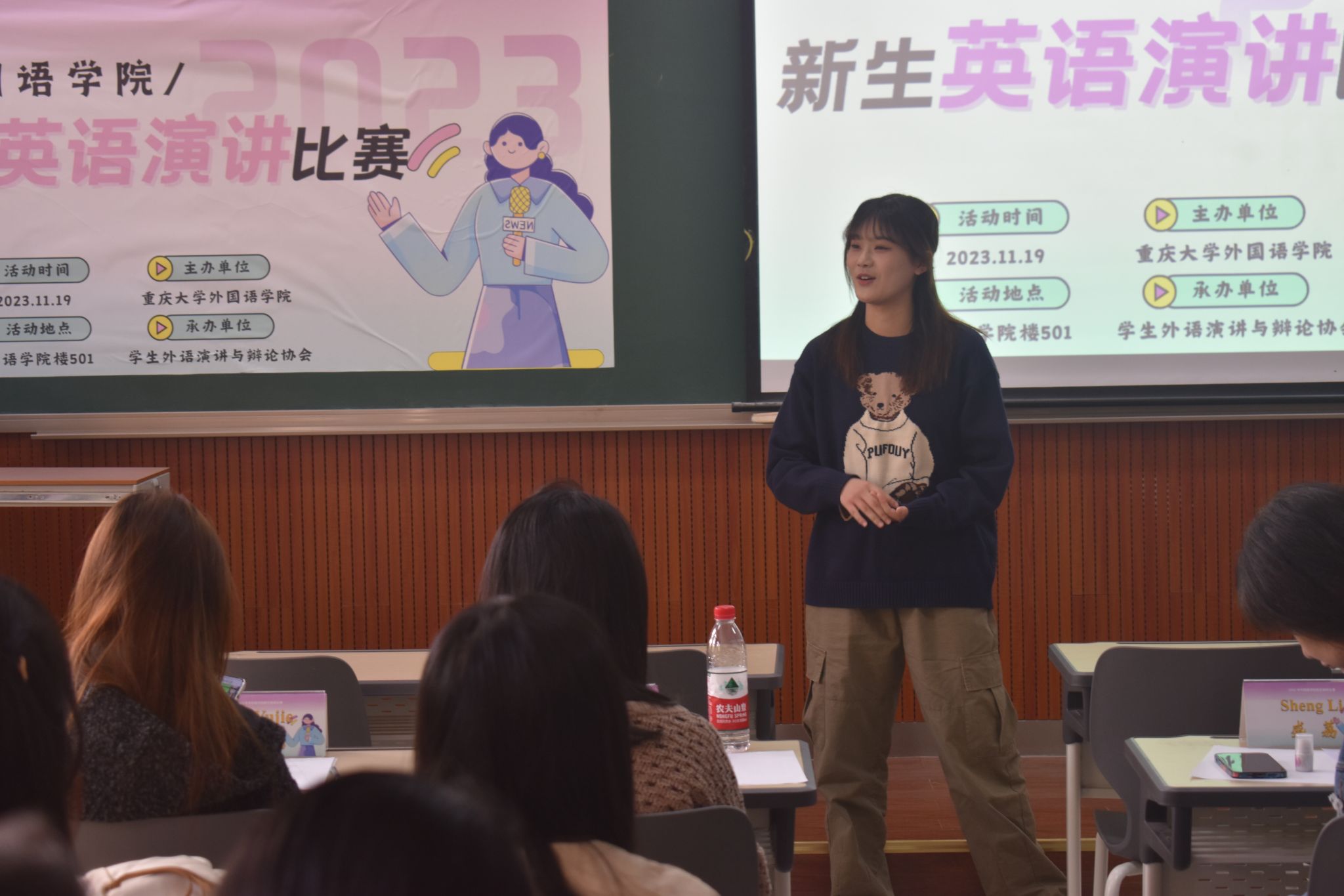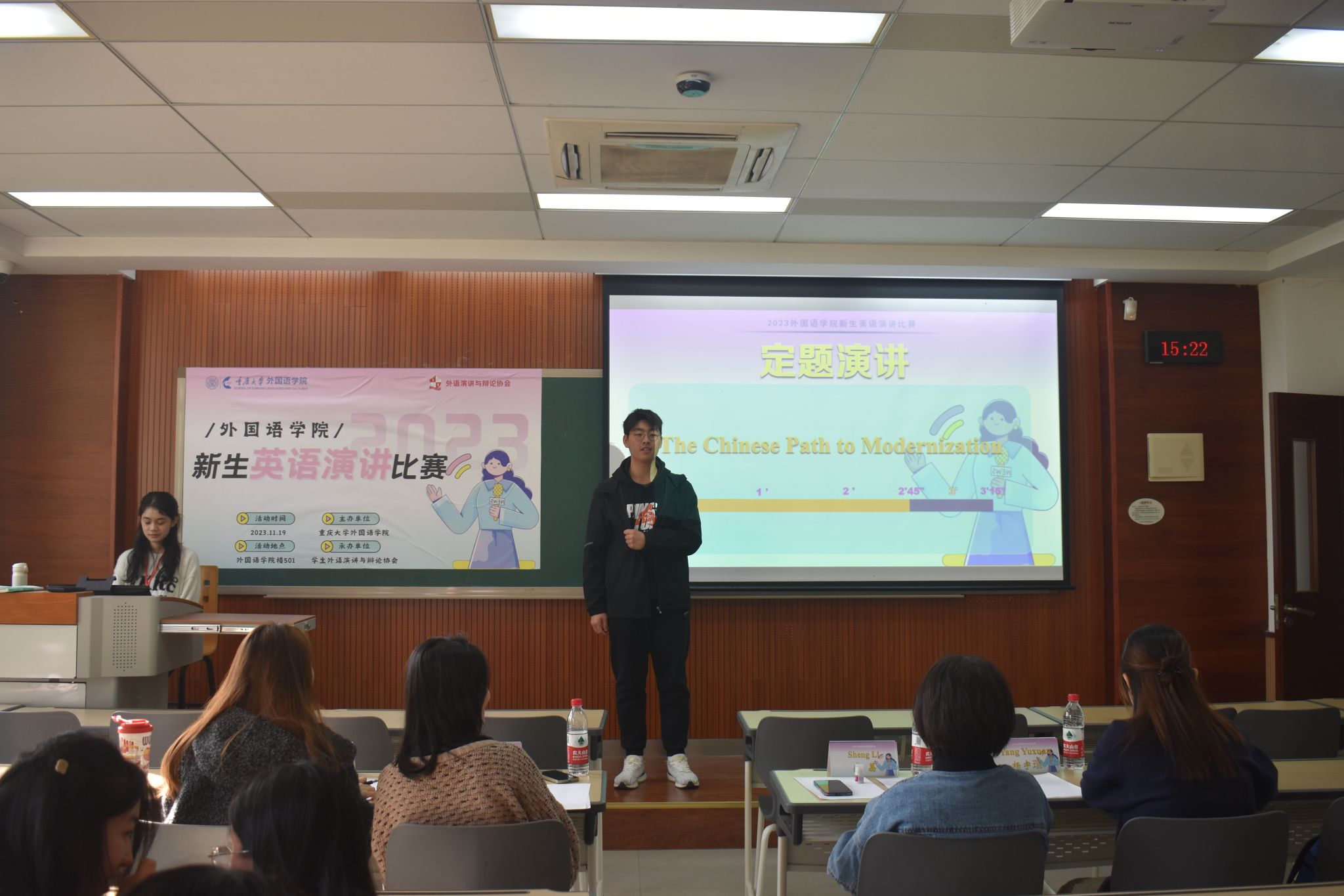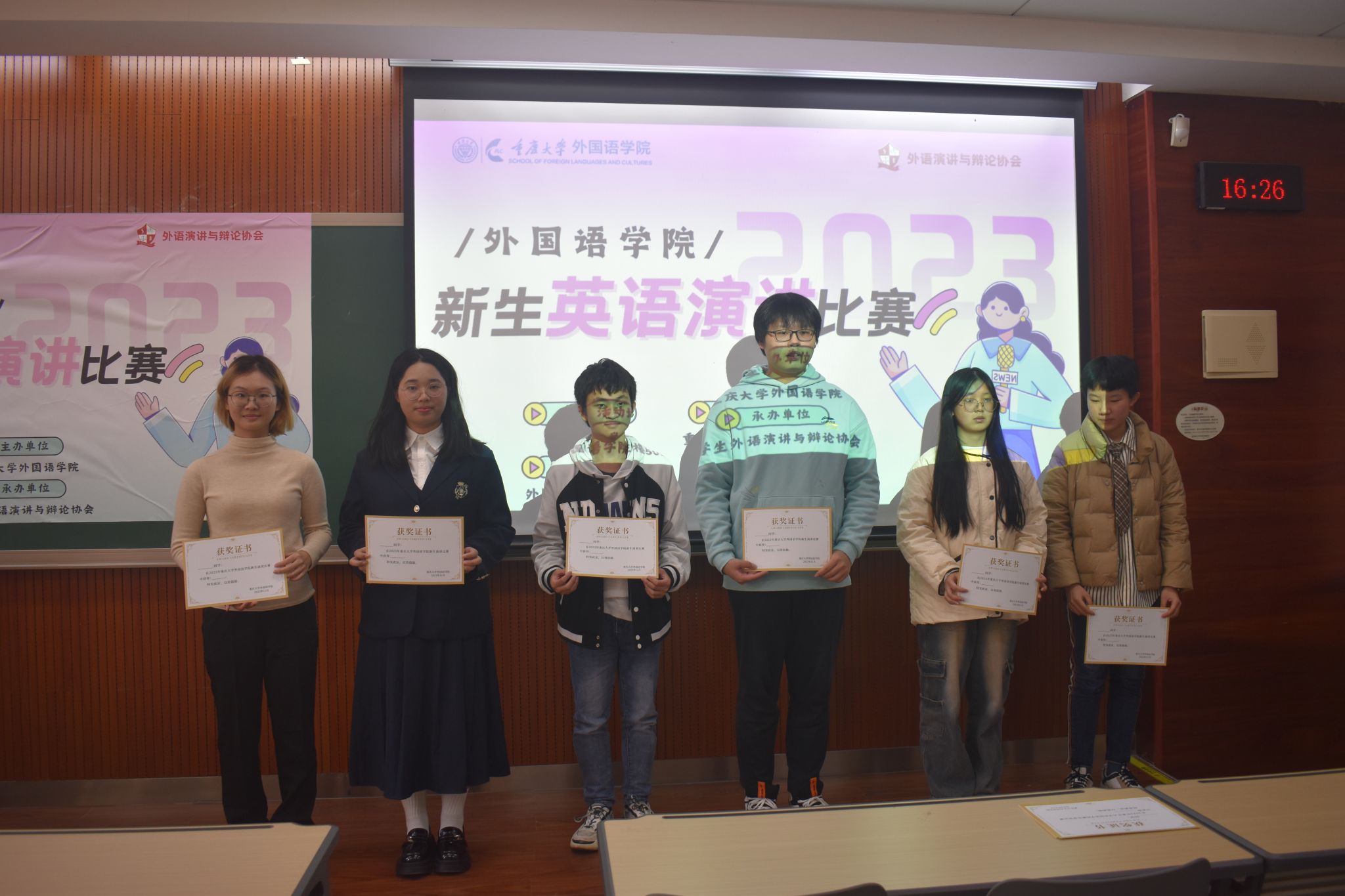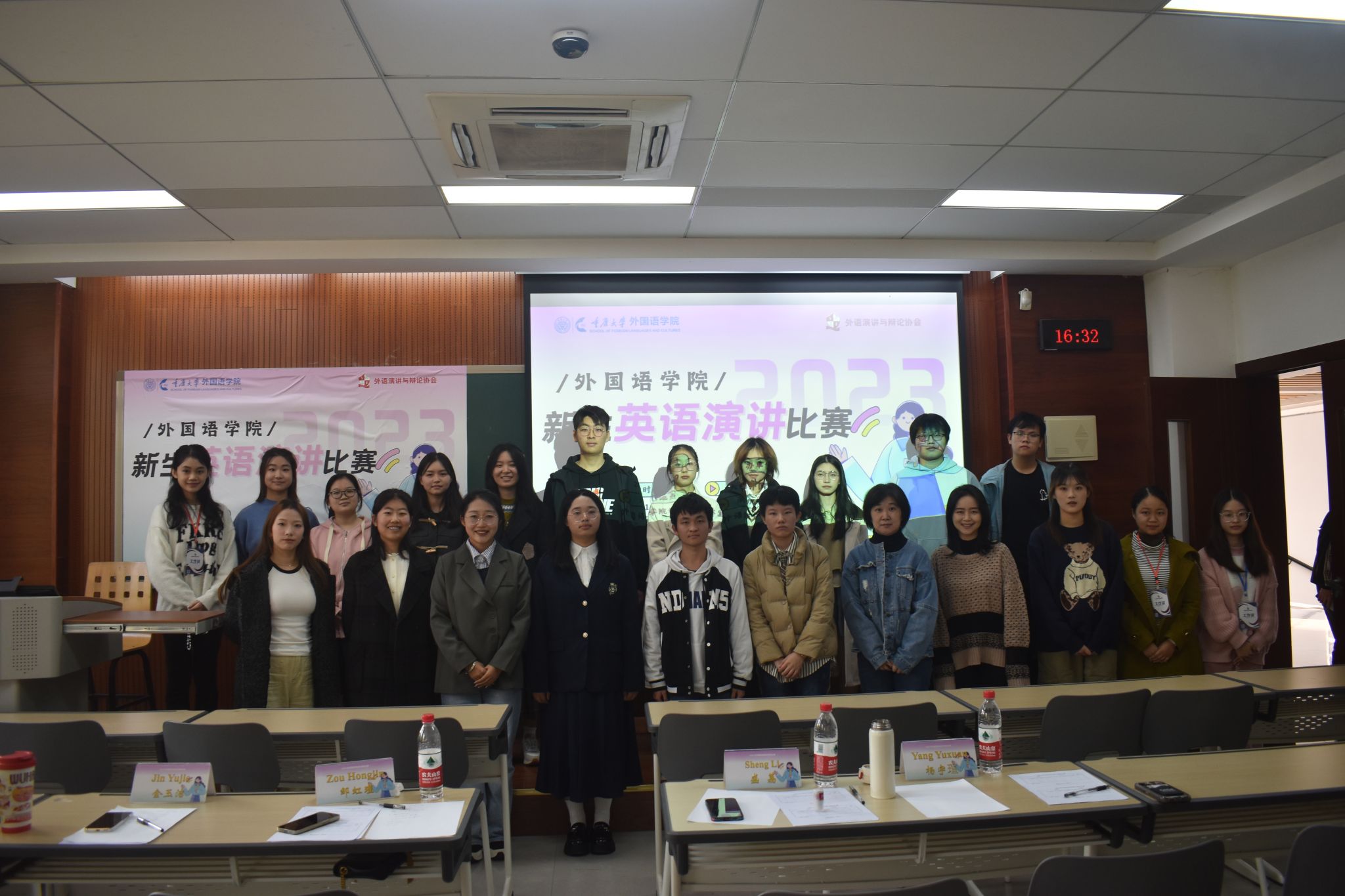 主办,学生外语演讲与辩论协会承办,由英语系老师盛荔、邹虹瑾,英语演讲省赛获奖选手杨宇瑄、金玉洁等4人担任此次比赛的评委,2023级本科生各班级共推荐16位选手参赛。