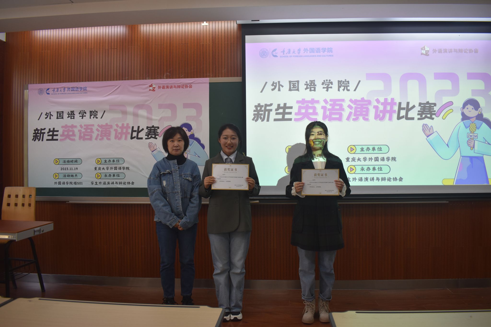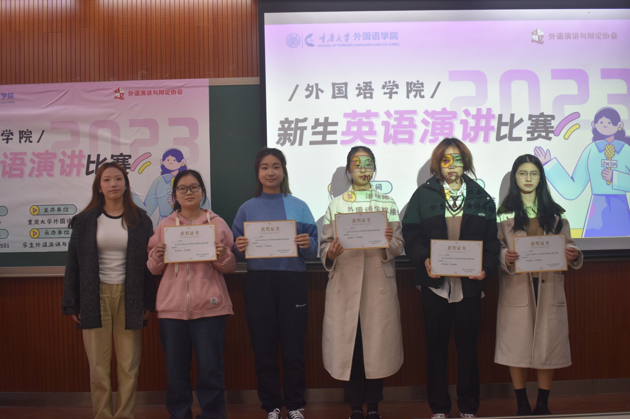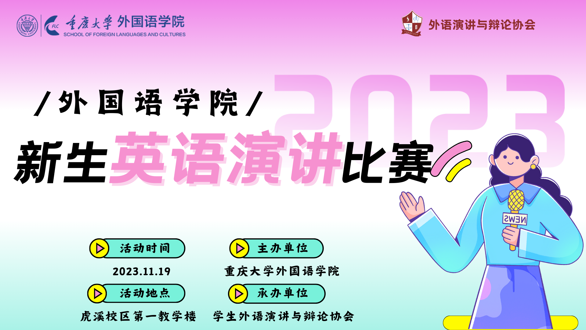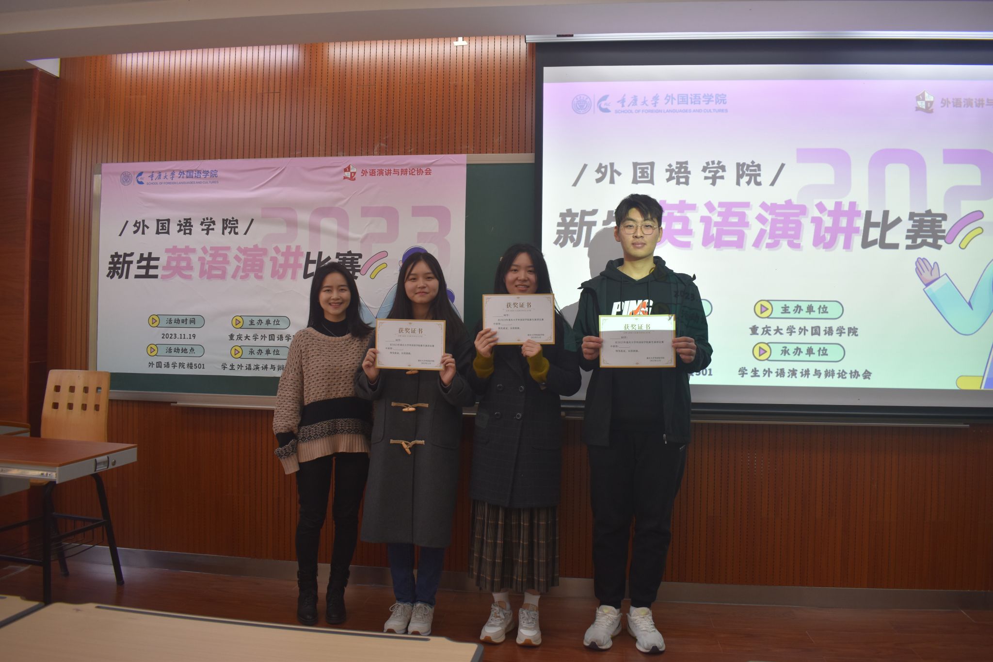 主办,学生外语演讲与辩论协会承办,由英语系老师盛荔、邹虹瑾,英语演讲省赛获奖选手杨宇瑄、金玉洁等4人担任此次比赛的评委,2023级本科生各班级共推荐16位选手参赛。