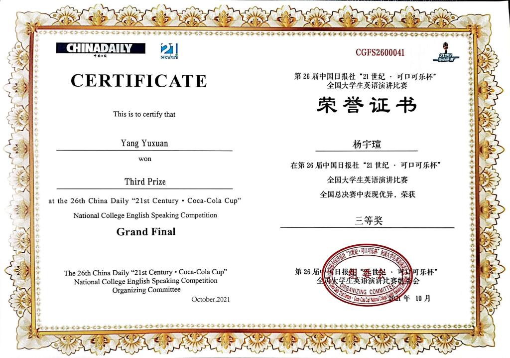 第二十六届中国日报社“21世纪·可口可乐杯”全国大学生英语演讲比赛全国总决赛于10月3日-6日在四川成都ICON·天府云端音乐厅举行,来自全国各赛区各高校的选手们齐聚一堂。我院2020级英语专业杨宇瑄同学此前以川渝赛区冠军的成绩成功赢得国赛入场券,本次代表磁力猫