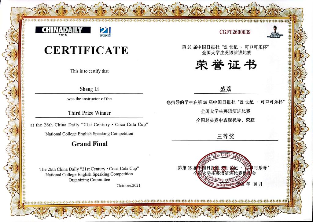 据悉,本次大赛赛题涉及到了建党百年、女性主义、弘扬和传承中华传统文化等多个主题,对选手的知识储备和语言逻辑能力有着很大的考验。我校选手杨宇瑄作为大一学生参加大赛省赛,后入围国赛并在国赛舞台上大放异彩取得可喜成绩,使我校再次在该赛事上赢得国家级奖项。这不仅体现了学生优秀的英语应用综合素质能力,也是我校英语教学水平和第二课堂教学的丰硕效果。