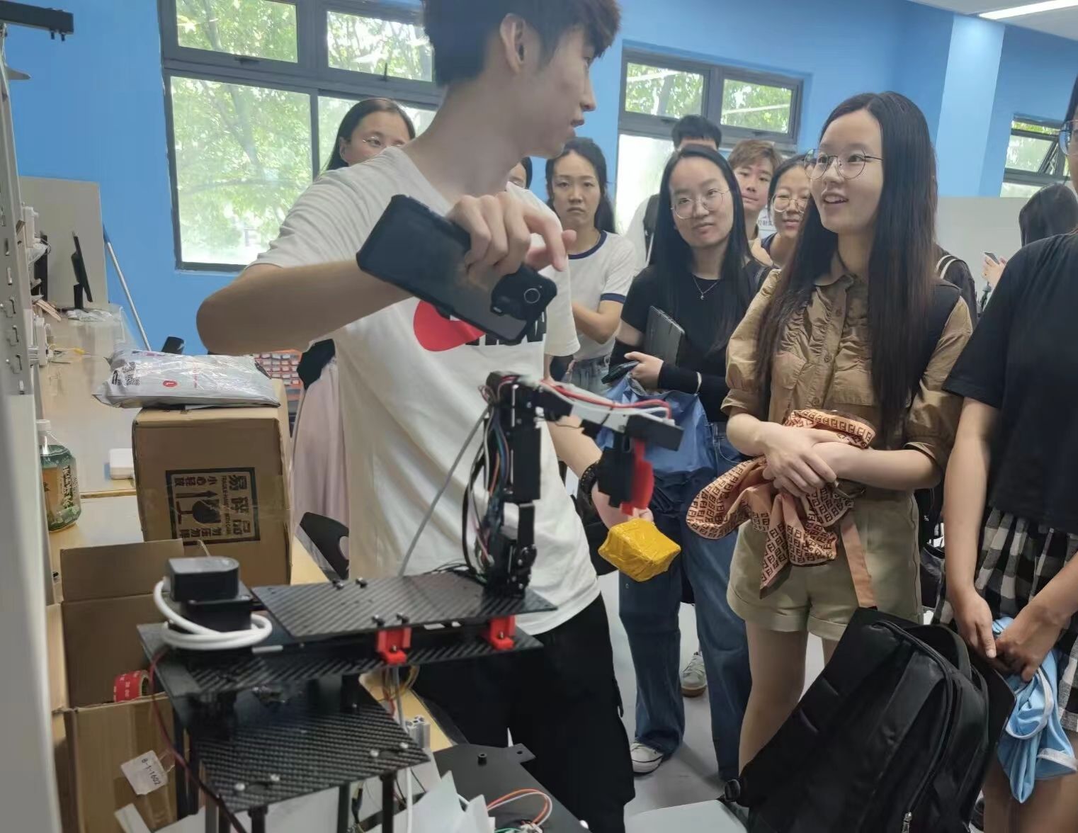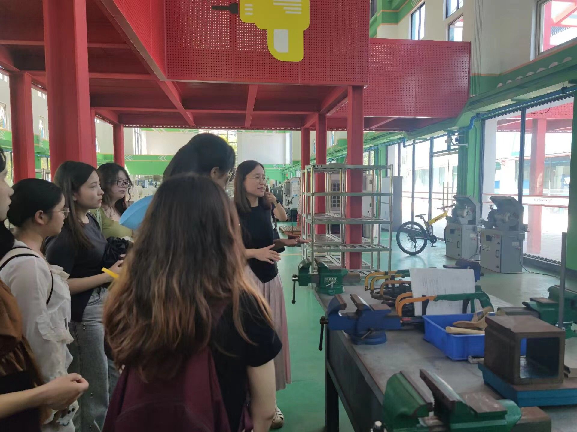在沈老师的指引下,同学们参观了3D打印间、木工坊、智能汽车实验室、制造中心、工程培训中心、无人机实验室等一系列实验地点和实践地点,近距离地感受了现代科技的魅力。同学们不仅深化了对各种科技产品和工具的认识,还拓宽了译者知识库,学习了相关术语,为未来的翻译工作积累了宝贵的知识。