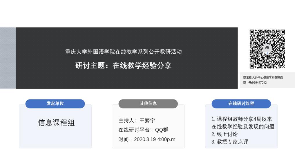 大学英语信息学科课程组依托QQ电话召开了公开教学研讨会议。本次教研活动的主题是“在线教学经验分享”。
