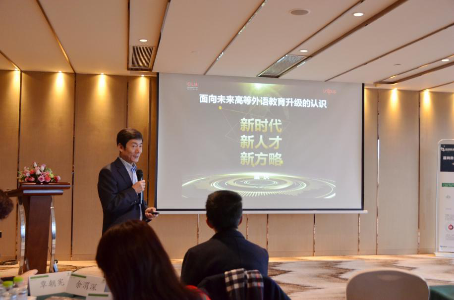 外研社总编辑徐建中随后发表题为《新时代,新人才》的讲话。他提出,新时代的人才应当是“国才”,意即国家人才和国际人才,而外语教育工作者应当升级认识,构建面向未来的高等英语教学。