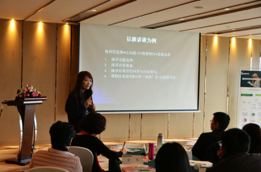的李小辉教授带来。任文教授的主题发言以英语演讲、写作和翻译课程教学为例,论述如何将批判性思维训练融入外语教育过程。在她看来,批判性思维是由认知能力、思维倾向、思维品质三部分组成的,三者缺一不可。她以一次讲座中一位表现积极却提问质量较低的学生为例阐述了这一观点,得到了老师们的强烈认同。